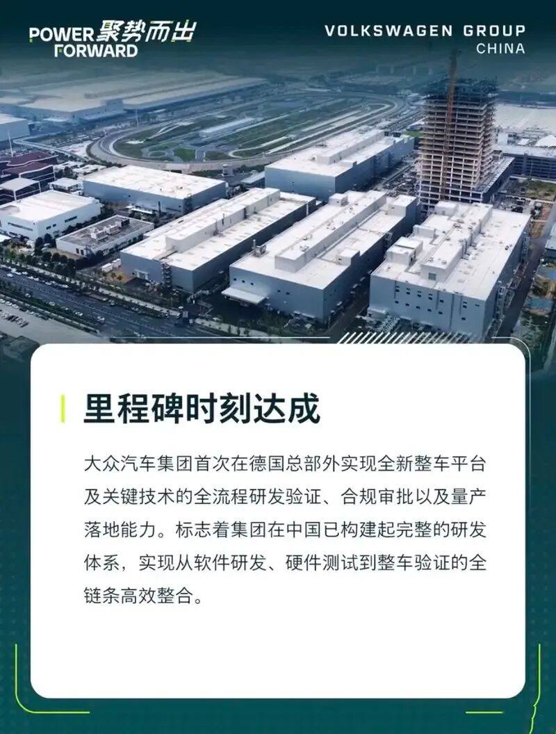 全新整车平台及关键技术的全流程研发验证、合规审批以及量产落地,完整链路首次在海外实现,大众汽车集团在中国已构建起完整的端到端研发体系。全新批次测试车间约10万平方米,配备逾百间先进实验室,软硬件集成、电池与动力总成测试、整车级验证全面整合,一站式搞定。