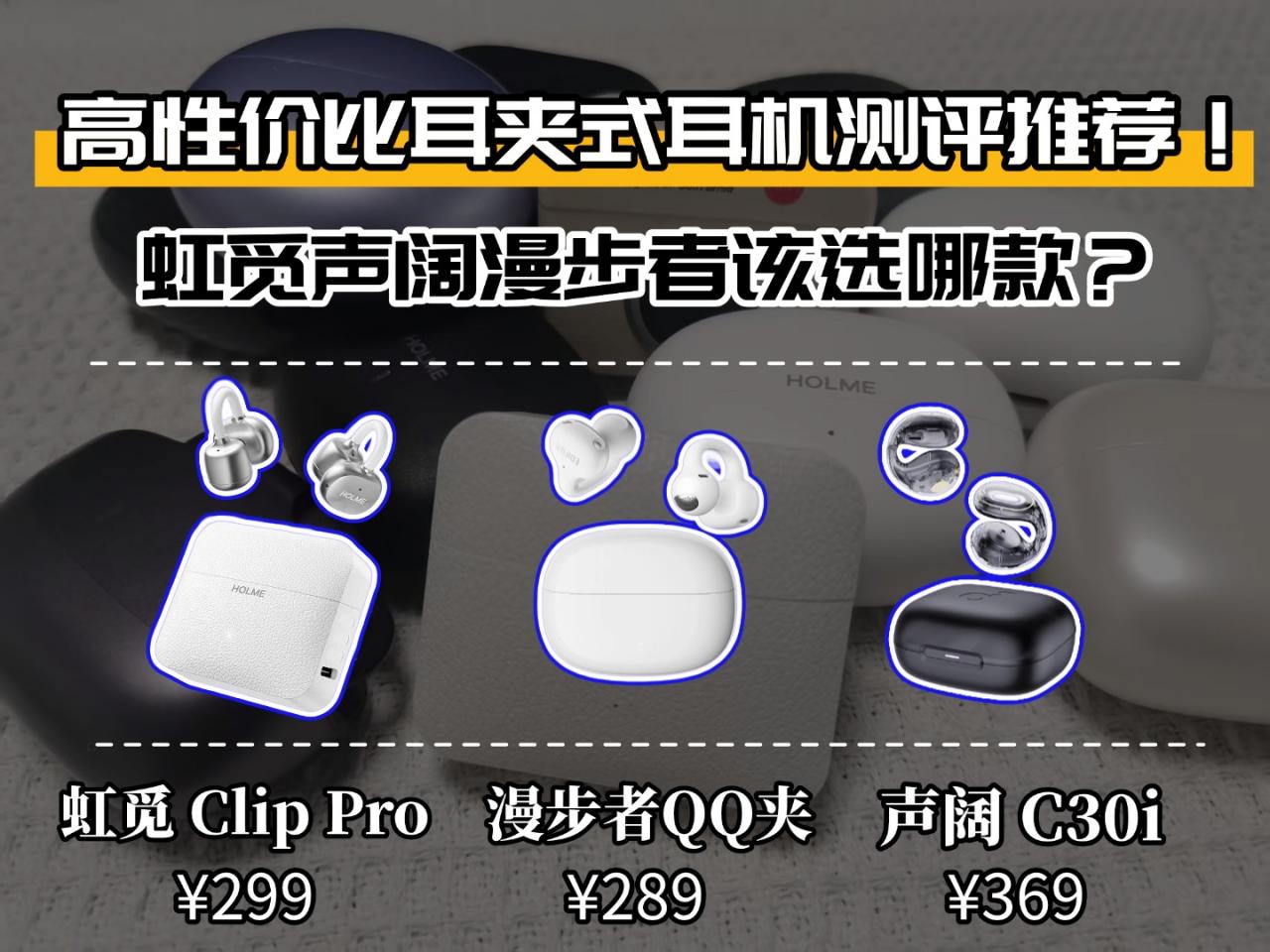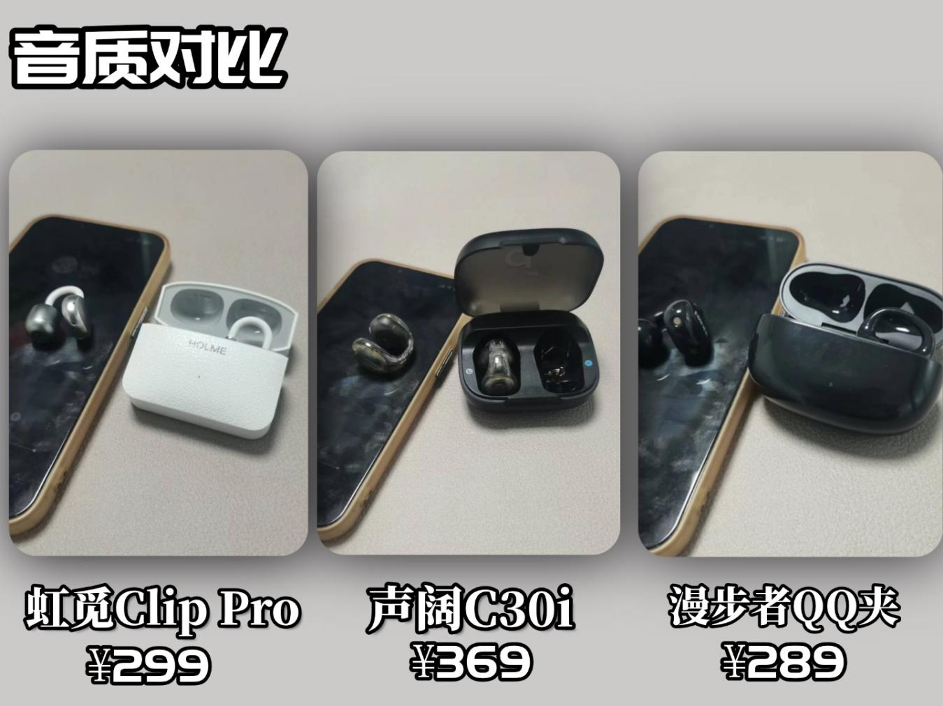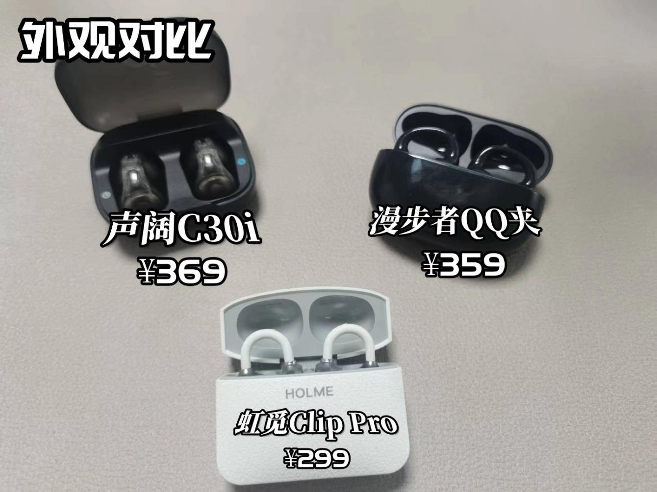 我做了这么久的耳机博主,太懂大家的顾虑了,特意挑了三款近期卖得火的机型实测,给大家一份实在参考。分别是299元的虹觅 Clip Pro、289元的漫步者QQ夹、369元的声阔 C30i,外观、佩戴、音质、防漏音这些大家最关心的点,我都一一试过了。