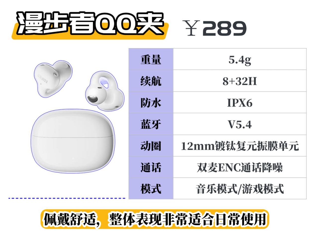 漫步者QQ夹 我觉得最实用的还是是防水,这是它的最大优势!它使用的蓝牙5.4,连得又快又稳,还能连两个设备,切换起来很方便。有DPW定向传音技术,能少漏音、护隐私;双麦通话降噪能分清人声和杂音,打电话听得清楚。