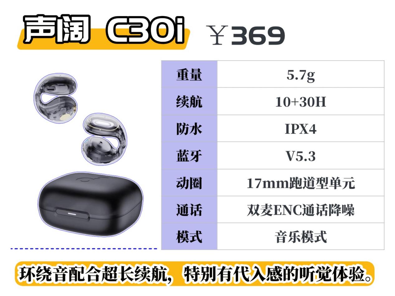 对音质有要求的,声阔 C30i(369 元)可以考虑。大动圈加环绕音效,声场宽、解析力好,音质表现突出。但它久戴会夹耳,价格也比另外两款高,性价比一般,更适合对音质敏感、不会长时间戴耳机的人。