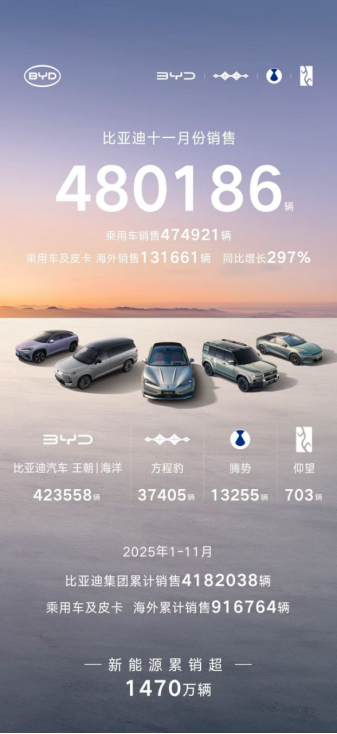 2025年11月的车市,不少品牌还陷在“降价换量”的纠结里,比亚迪却直接甩来一份亮眼成绩单:全月卖了480186辆,创下今年新高。更狠的是海外市场,单月交车131661辆,比去年同期翻了近三倍。这些数字看着热闹,实则藏着中国新能源车的一个大变化——咱们早不是只靠走量撑场面,现在是带着技术往全球市场冲。