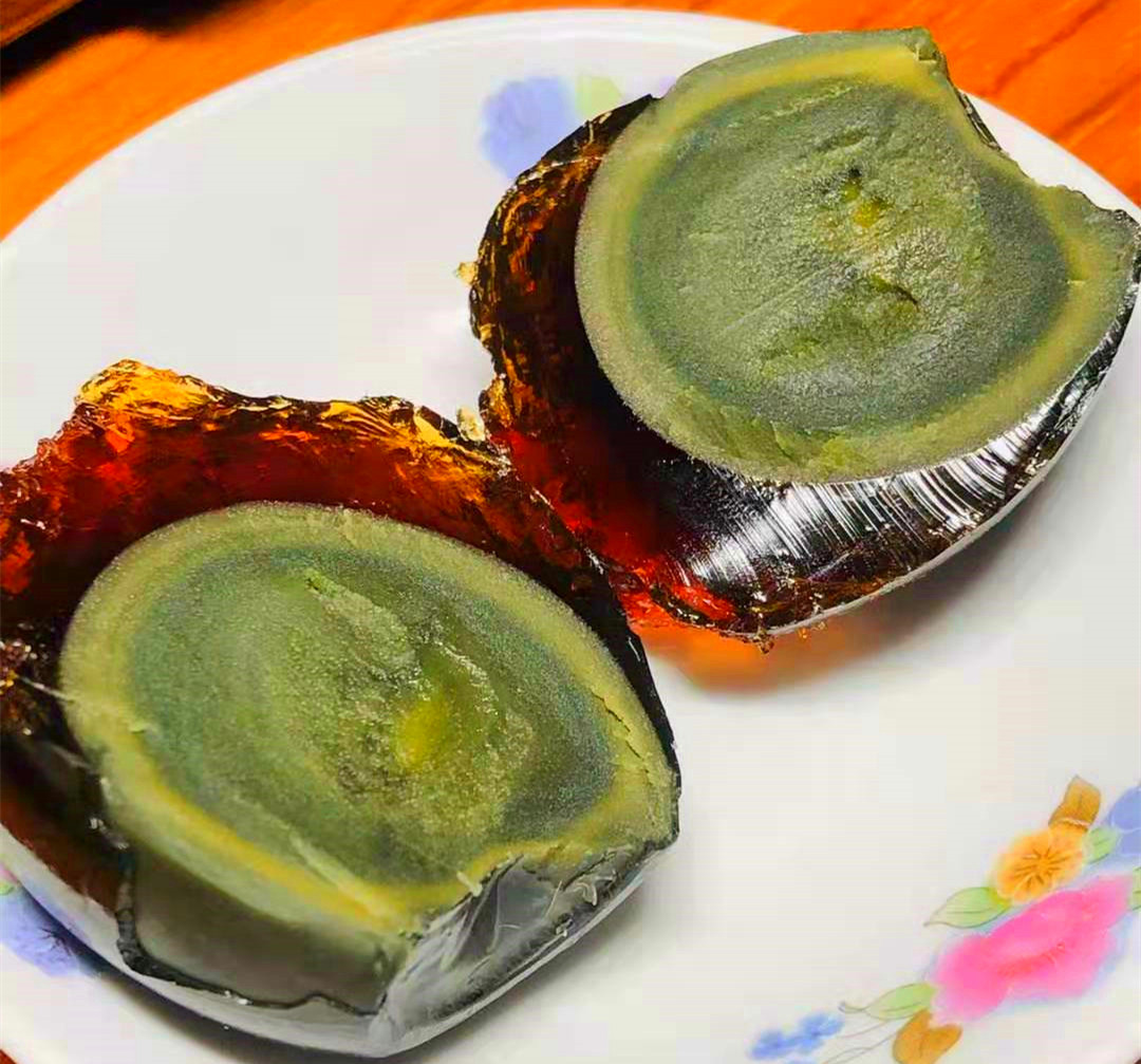 古方制作皮蛋:传统的工艺做法就是将新鲜的鸭蛋或鸡蛋浸入食盐、茶叶、生石灰或者草木灰,经过长时间的浸泡,形成氢氧化钠和碳酸钙,氢氧化钠通过蛋壳渗透,蛋清中的蛋白慢慢凝结,从液体变为胶状固体;而蛋黄中的脂肪、蛋白质同样被分解,释放出风味物质,从颜色和气味都得以改变,形成皮蛋。