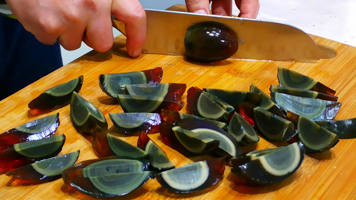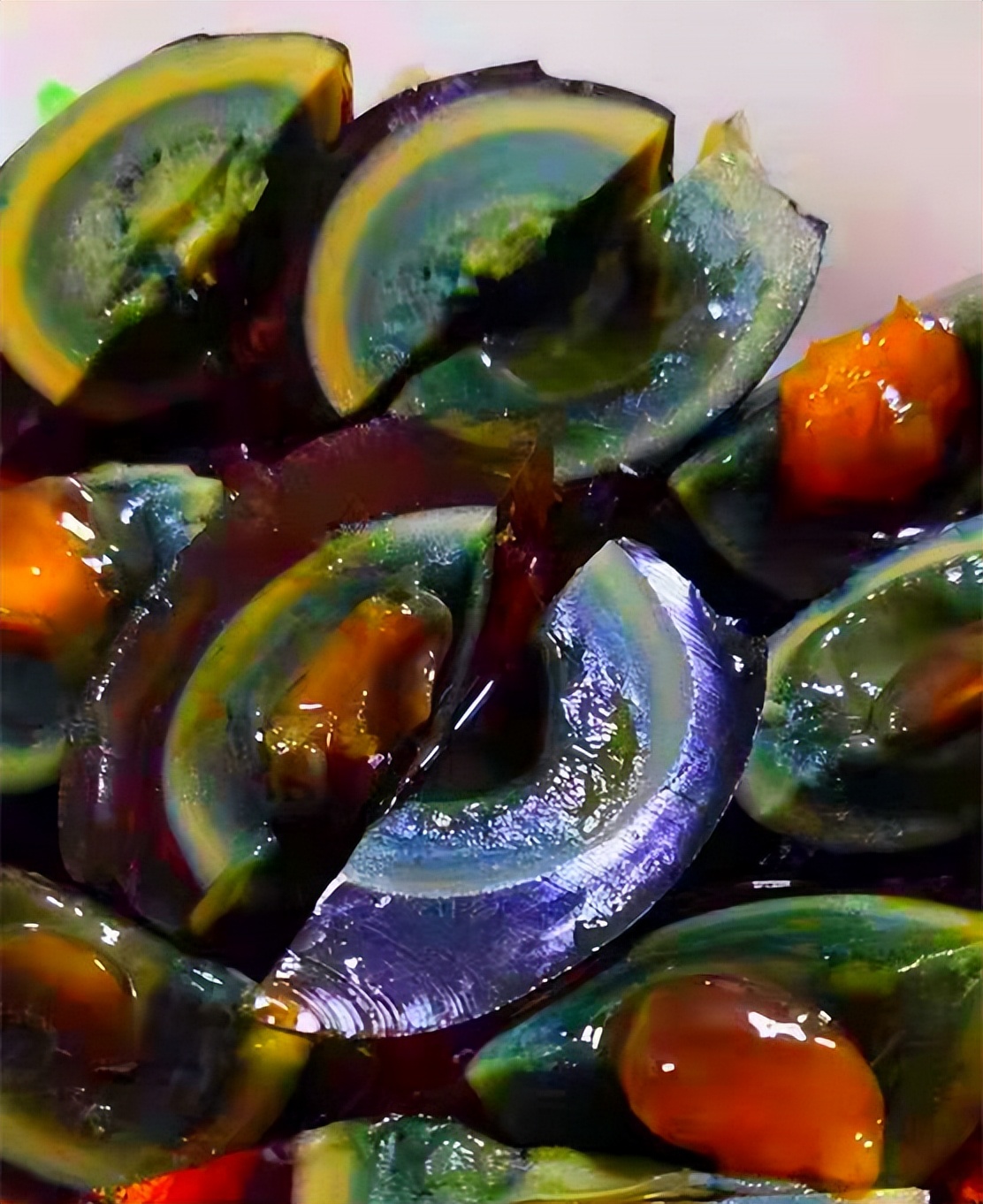 皮蛋制作原理:一颗青壳鸭蛋呱呱坠地,浸入氢氧化钠和金属离子的透明结界,碱液透过蛋壳的细小孔渗透到鲜蛋内,催化蛋白质和脂肪结构重组,并分解出多种氨基酸,形成独特鲜味。其中碱液和金属离子使得澄清的液态卵蛋白转化为弹性凝胶质地,蛋黄中的卵黄蛋白形成溏心质感,而碱性环境使得蛋白中原有的镁离子析出,形成好看的松花图案。