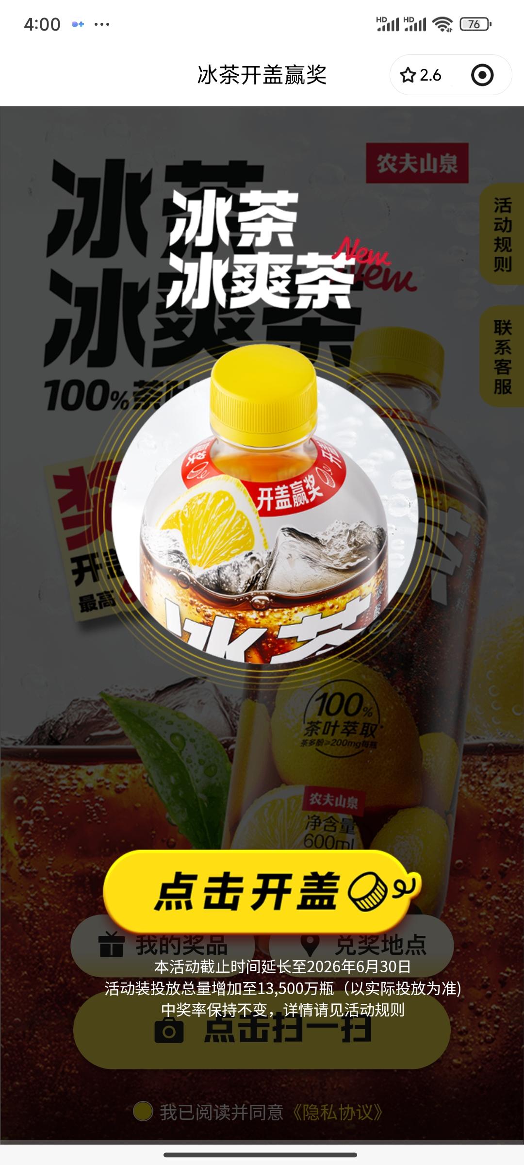 2. 扫码兑奖:即时知晓中奖结果用微信扫描瓶盖上的二维码,无需复杂注册,直接跳转活动页面查看中奖结果。奖励设置很实在,主要分为两大类:一是“一元换购”资格,这是最常见的奖励,中奖后可额外花1元再换购一瓶同款冰茶;二是现金红包,金额多为0.5元起,最高可开出666元大额红包。亲测下来,买6瓶大概率能中4瓶“一元换购”+1个现金红包,运气好的话直接实现“冰茶自由”。3. 线下核销:20天内完成换购如果抽中“一元换购”,要注意兑换期限是中奖后20天内。打开活动页面会自动定位附近的可兑换门店,拿着中奖的瓶盖到店,让店主通过农夫山泉“一店通”小程序扫码核销,支付1元就能领取新的冰茶。这里要提醒一句,部分门店可能会拒绝兑换非本店销售的产品,建议优先选择购买时的门店核销更顺畅。
