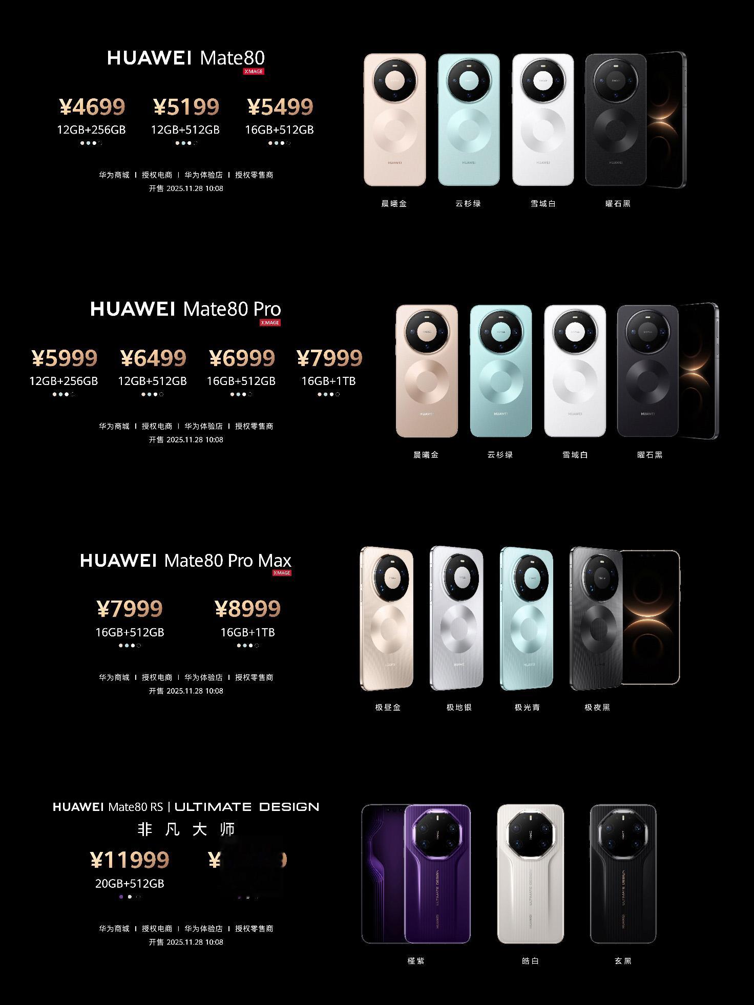 在迭代中迎来多方面重要升级的华为Mate 80系列,以鸿蒙6作为桥梁,传达众多科技创新和体验进化,焕发蓬勃生机。华为Mate 80系列四款机型中,4699元起的Mate 80有料又超值:5999元起的Mate 80 Pro全面出彩,品价比更出色;7999元起的Mate 80 Pro Max融入超硬核科技,带来多项焕然一新体验;11999元的Mate 80 RS非凡大师以极致美学工艺与创新诠释非凡,是当下直板旗舰中的天花板级存在。对华为Mate 80系列感兴趣的朋友可到线下华为门店亲身体验,实力破圈的更多魅力,坐等各位解锁。