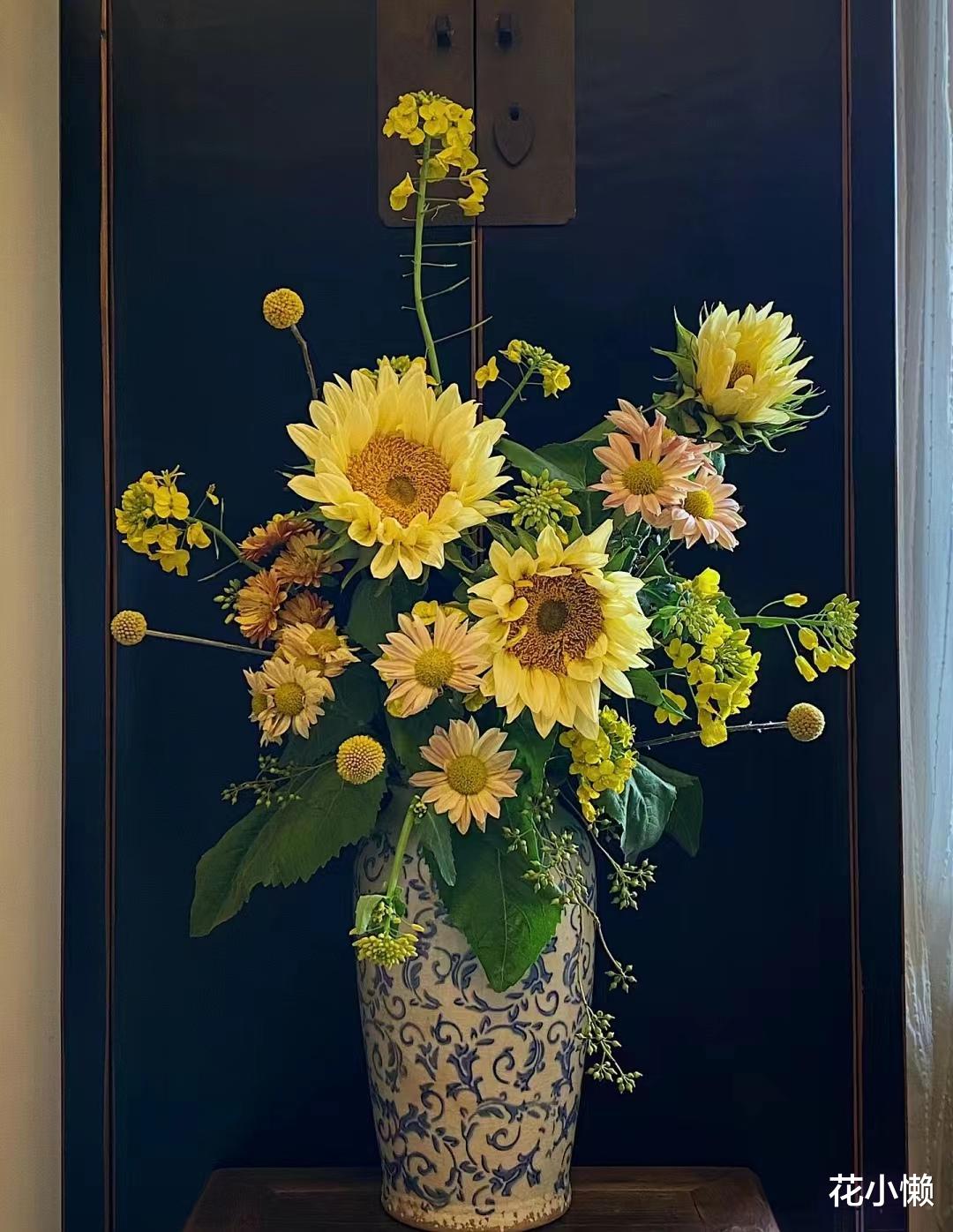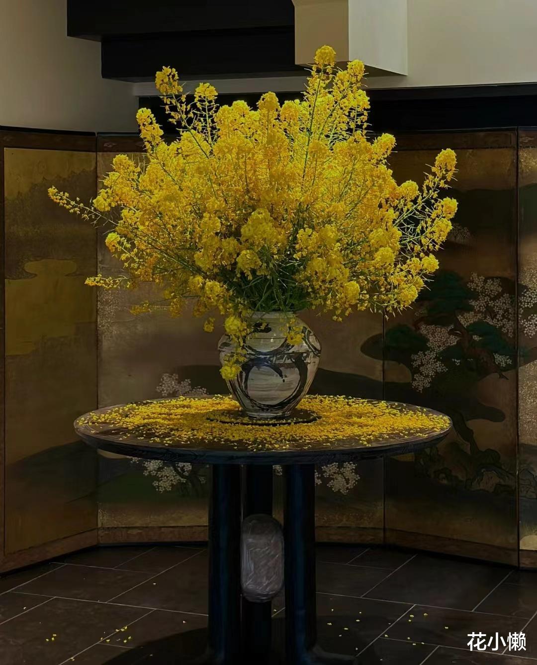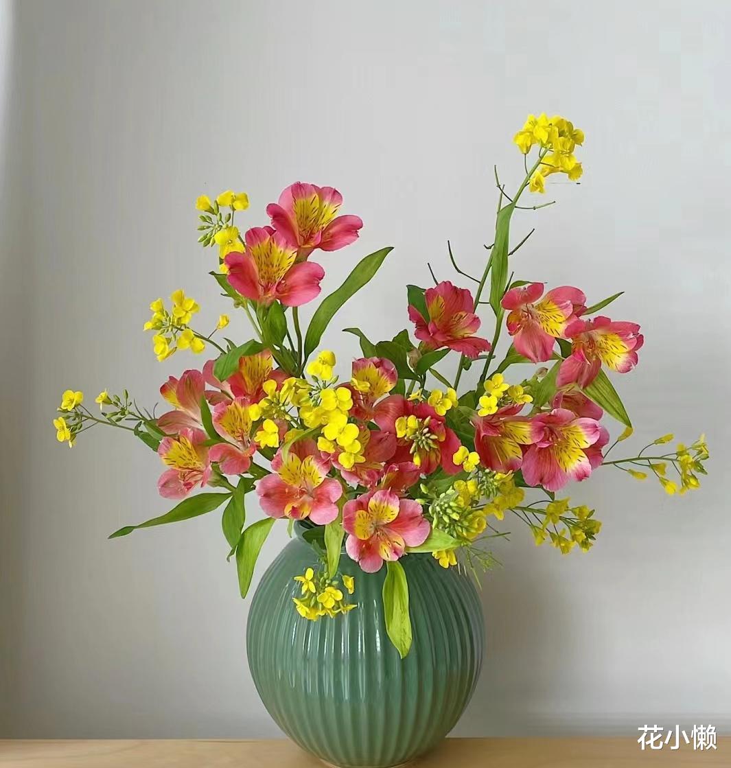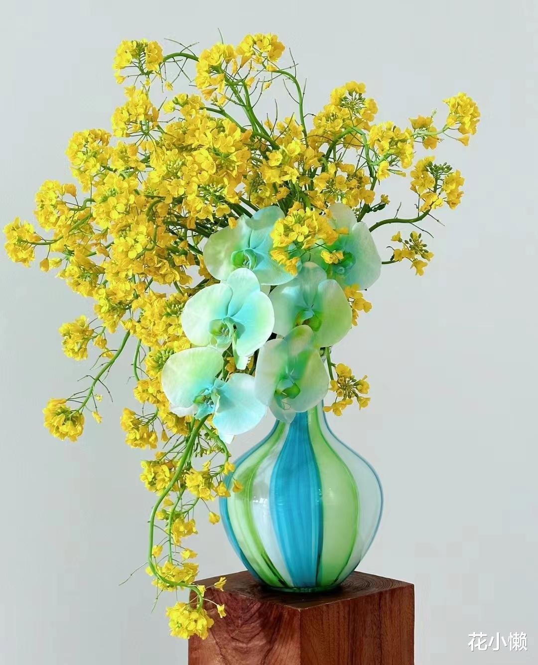 没想到小小的油菜花和其它鲜花搭配,竟然这么美,瞬间感觉春天的气息扑面而来。这才是插花真正的意义。