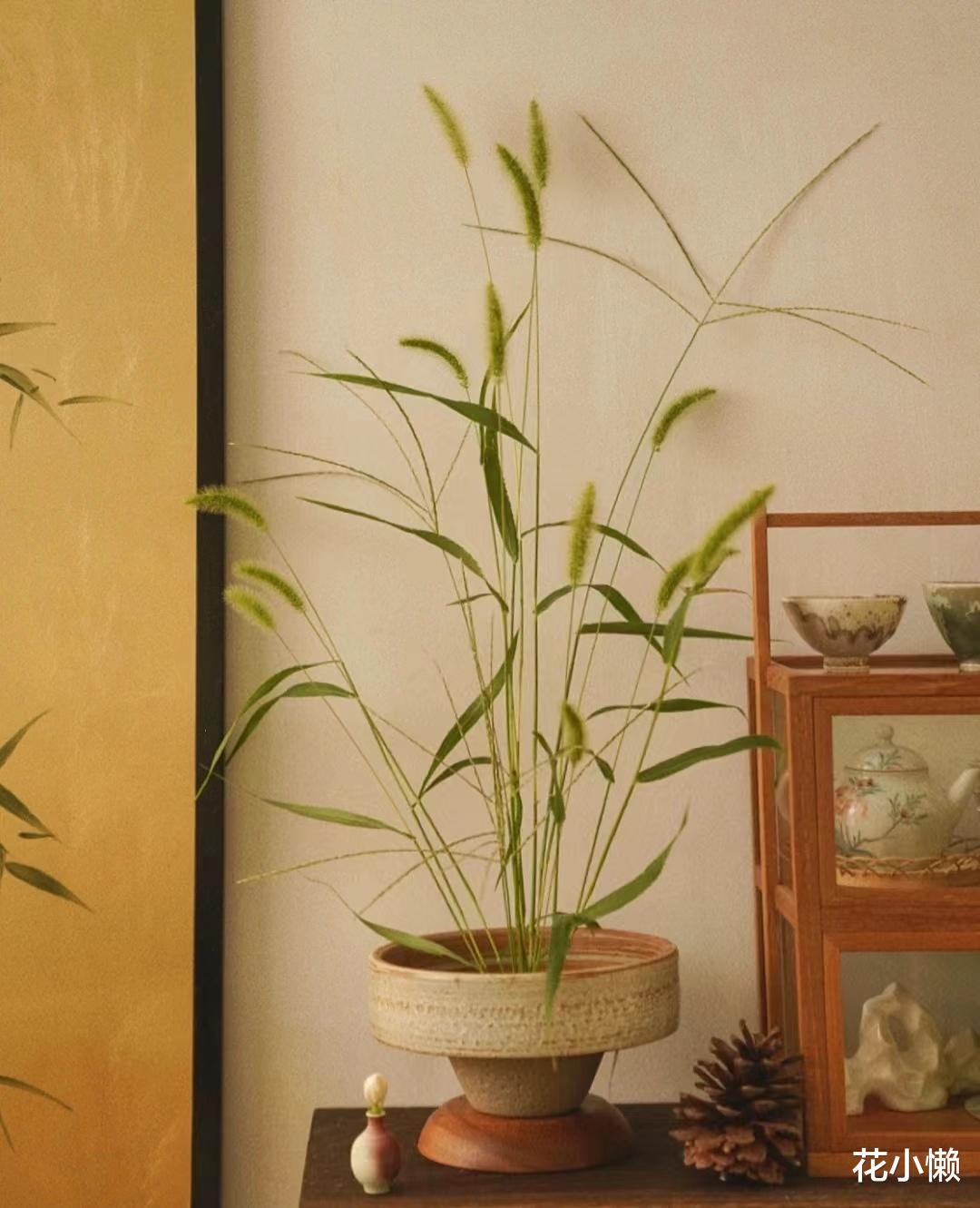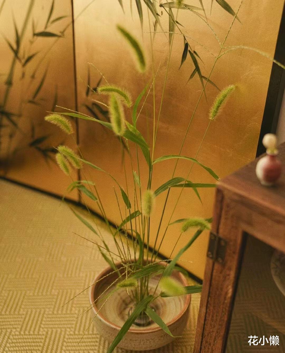 有位网友下班回家,看到小区草地里长满了一丛丛的狗尾巴草,觉得它们甚是可爱,便找机会剪回家插了花。狗尾巴草与不拘一格的花器组成的作品真是充满了生命力,即使是单一的叶材也不觉得单调,不得不说路边的野花就是香,摆好小生命顺便把一旁的透明提篮内置的茶具也重新收拾了一下,真是赏心悦目。测试了一下它们可以活个一周左右,虽然有些时间的痕迹,但是依旧好看。