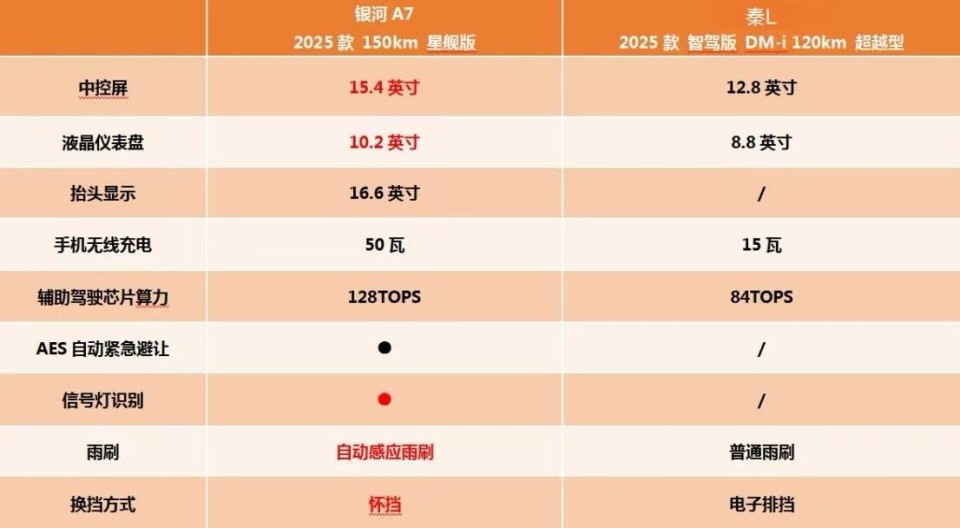 此外,银河A7搭载了2.5K分辨率的15.4英寸多媒体屏幕,液晶仪表盘尺寸为10.2英寸,而秦L DM-i的中控屏尺寸为12.8英寸,液晶仪表盘尺寸为8.8英寸,车机相对来说不如银河A7。