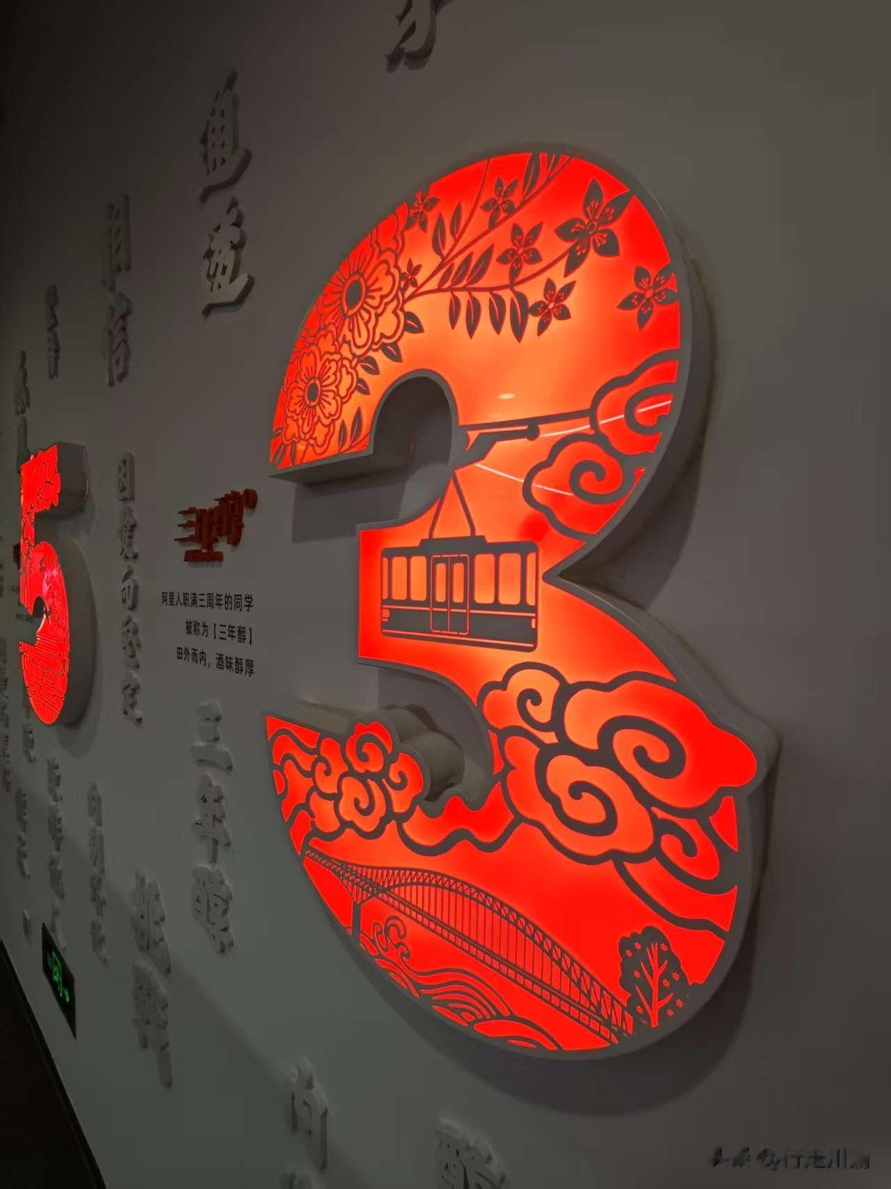 在代表员工入职年限的“年陈”墙上,我看到了这份独特的用心。象征入职一周年的数字“1”,内部镂空图案是重庆的城市地标——解放碑。而代表入职三周年的数字“3”,则描绘了一幅生动的山城图景:长江索道的缆车正缓缓滑过,下方是跨江大桥,周围祥云环绕。