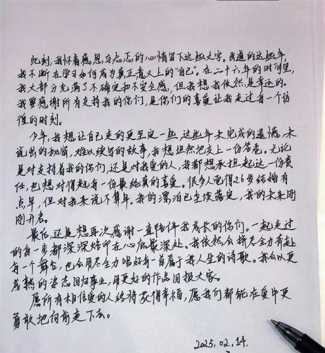 正如他在手写信中所言:“未来依旧会全力以赴每一个舞台,全力唱好每一首歌。”