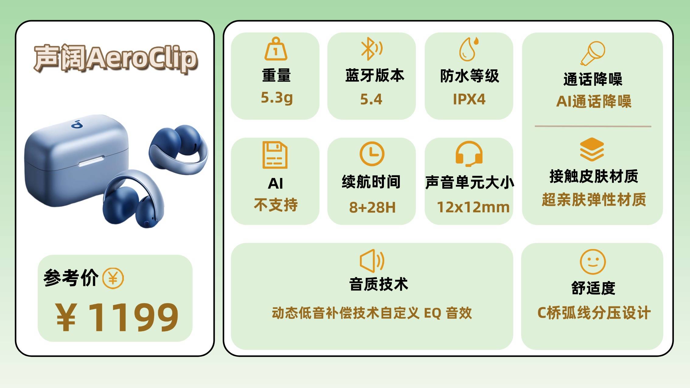音质方面,声阔Aero Clip耳机采用12mm钛金属单元,结合动态低频增强技术,使低音厚实有力、下潜充分,中高频层次分明、细节清晰,整体声场开阔均衡,成功跻身高品质音效行列。但需留意,在较大音量下仍存在可察觉的漏音现象,于安静环境中建议适度调节音量。
