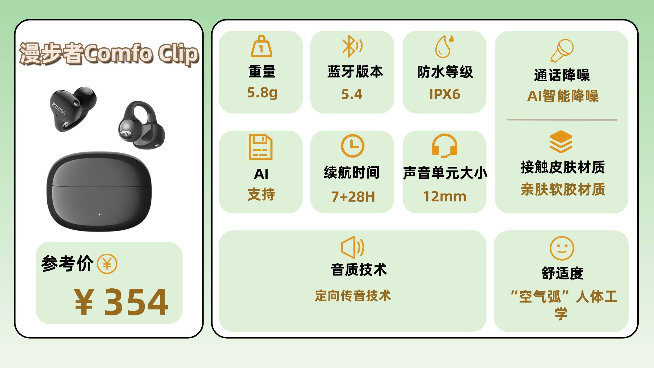 在平价蓝牙耳机领域,漫步者Comfo Clip堪称一款表现亮眼的新品。它创新性地结合半入耳的舒适感与耳夹式的稳固特性,打破了传统耳机形态,佩戴轻盈几乎无负担,即便在跑步、跳绳等剧烈活动中,依然能牢牢贴合耳廓,不易晃动或脱落。