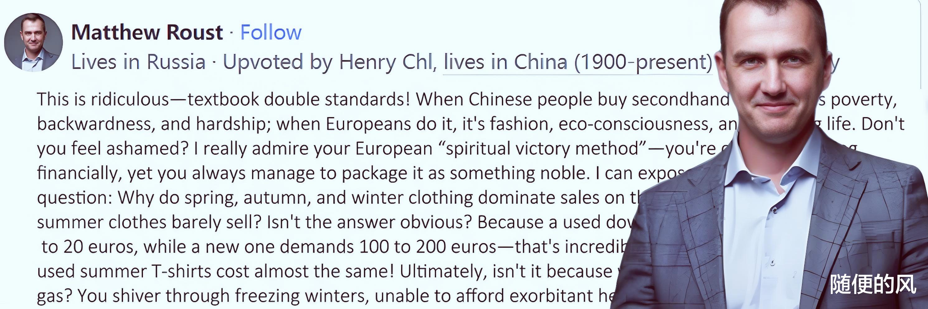太可笑了,这简直是教科书级别的双重标准。中国人买二手衣服就是贫穷落后,生活困难。欧洲人买二手衣服就成了时尚,环保,享受生活。你们不觉得脸红吗?