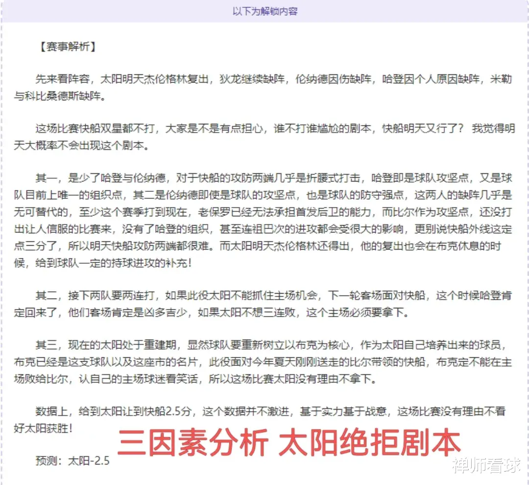 今天NBA只有一场比赛,咱们看好的太阳方向稳稳打出,这场比赛禅师从三个因素来分析,认为太阳面对快船,不会允许有剧本,果不其然,太阳在主场大胜了快船。明天来到超级比赛日,又是NBA杯的比赛,禅师已经做好功课,力争延续胜利!