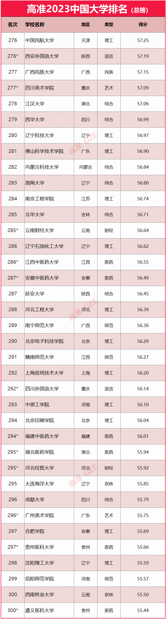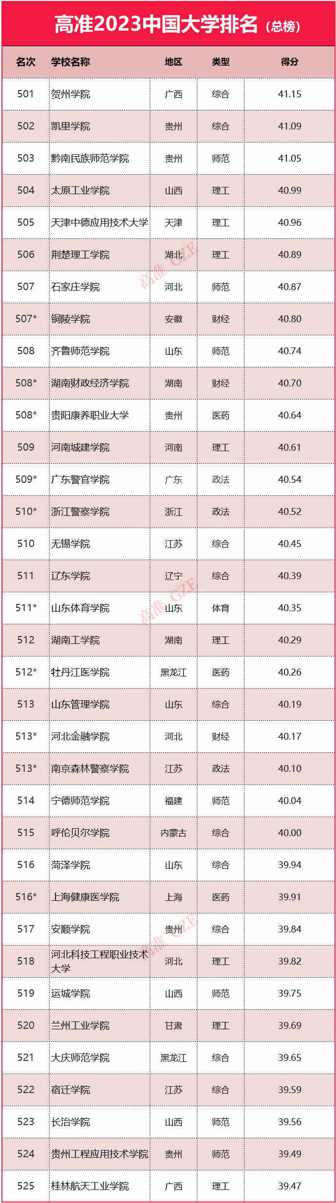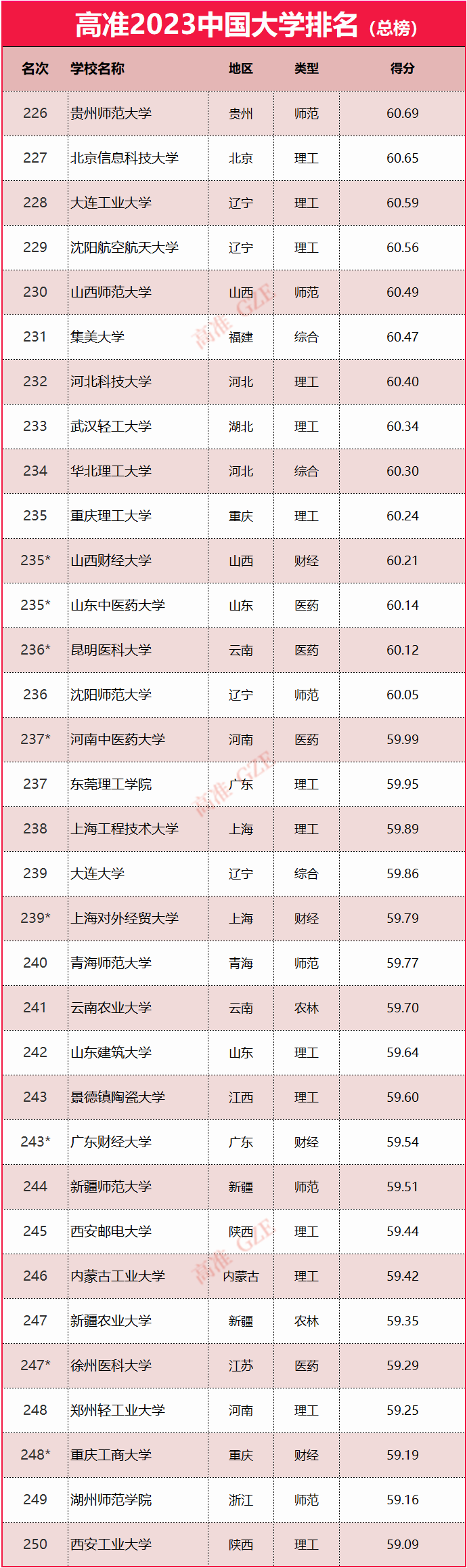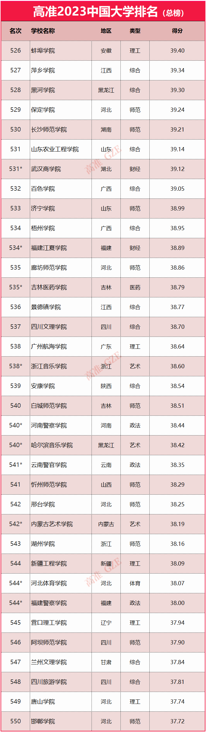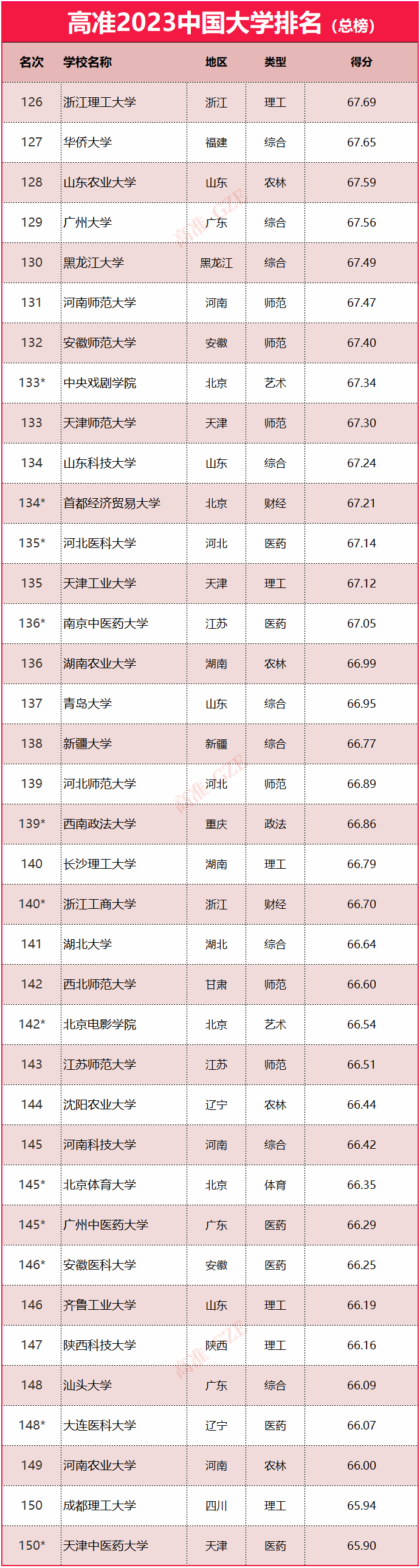 注:由于高准大学排行榜对医药类、财经类、政法类、语言类、体育类和艺术类高校进行单列排名,不占据主榜的名次,所以在总榜中对这6类学校的排名名次以*标识,带*符号为参考排名。中国科学院大学和中国社科院大学由于办学模式原因,也以参考位次进行排名。