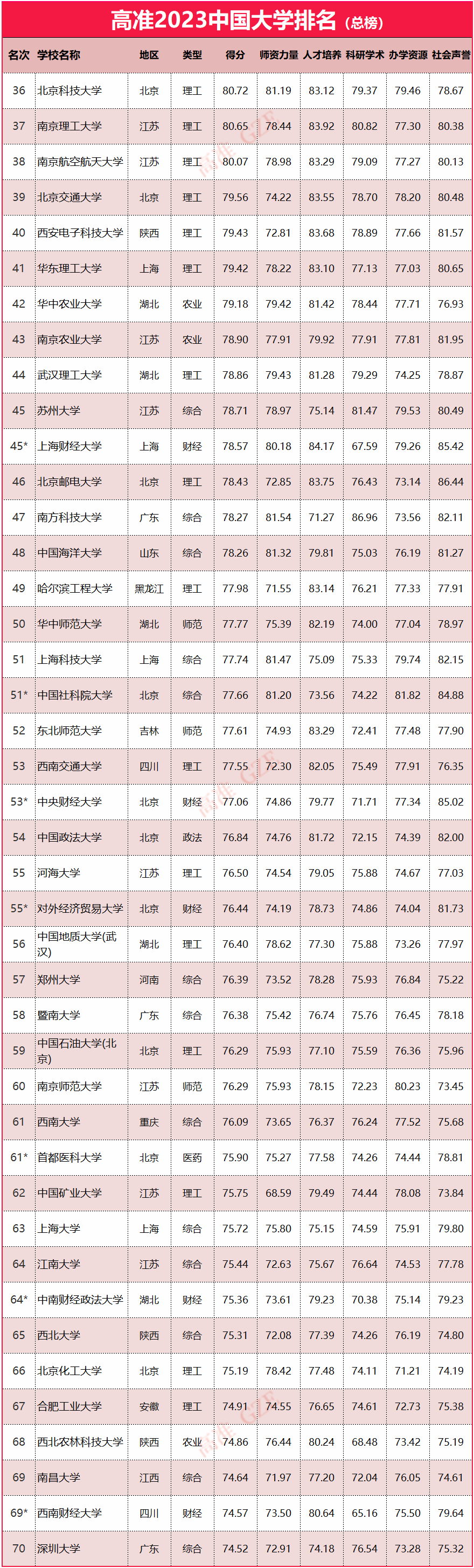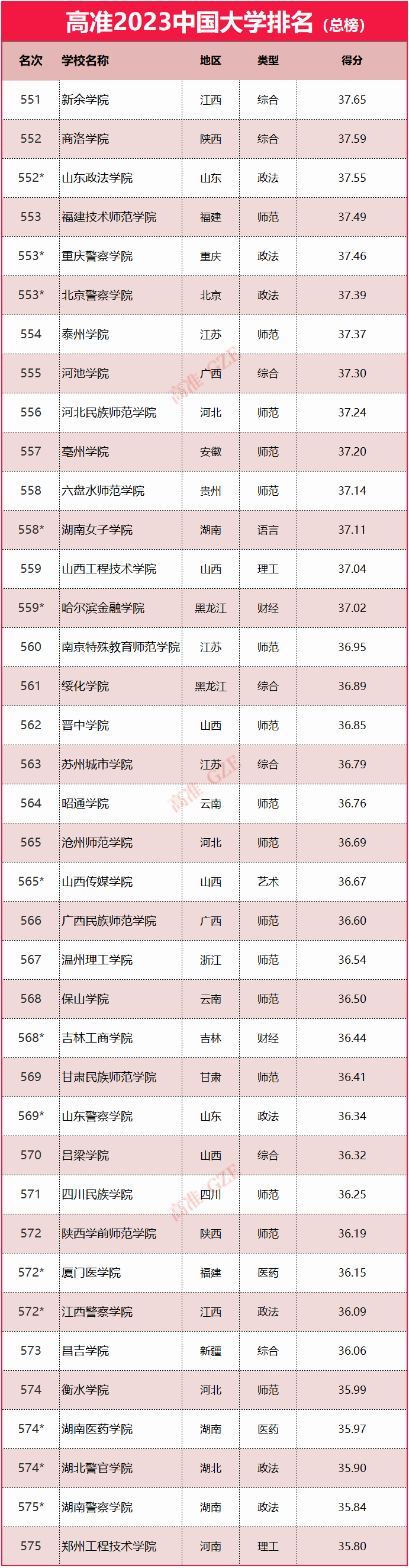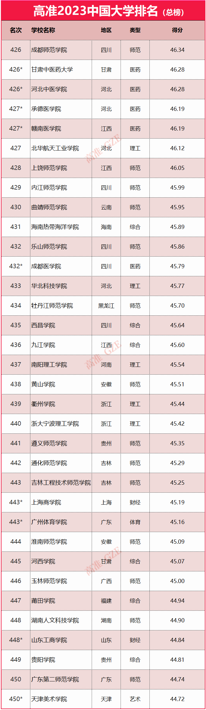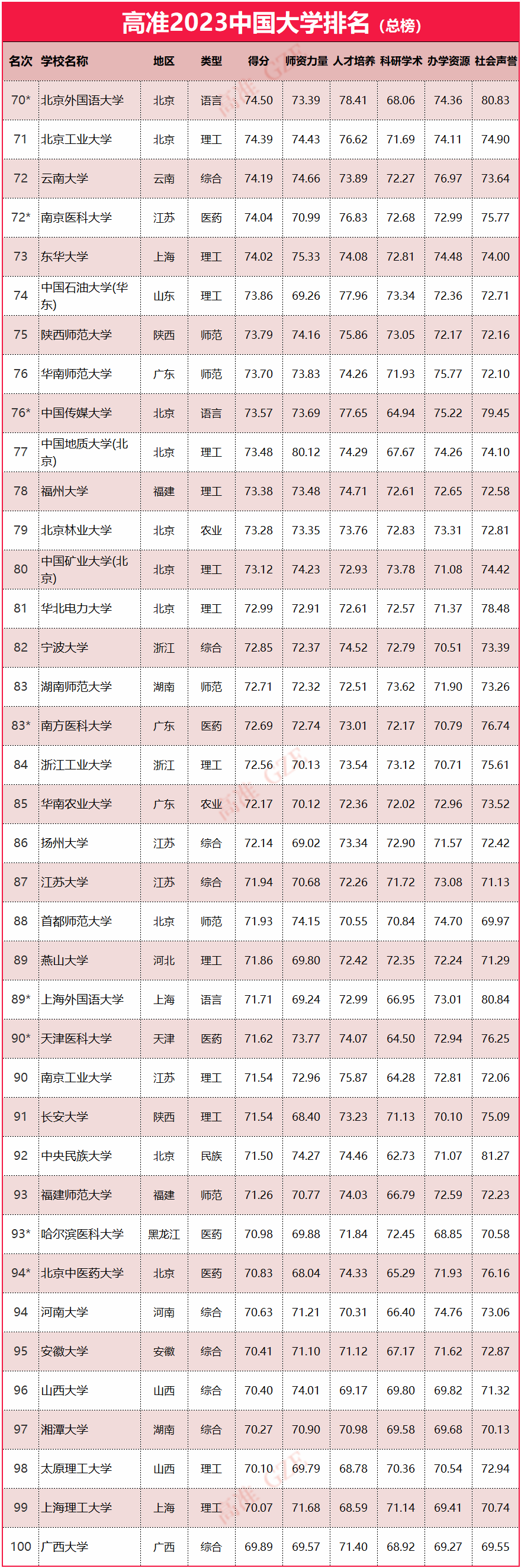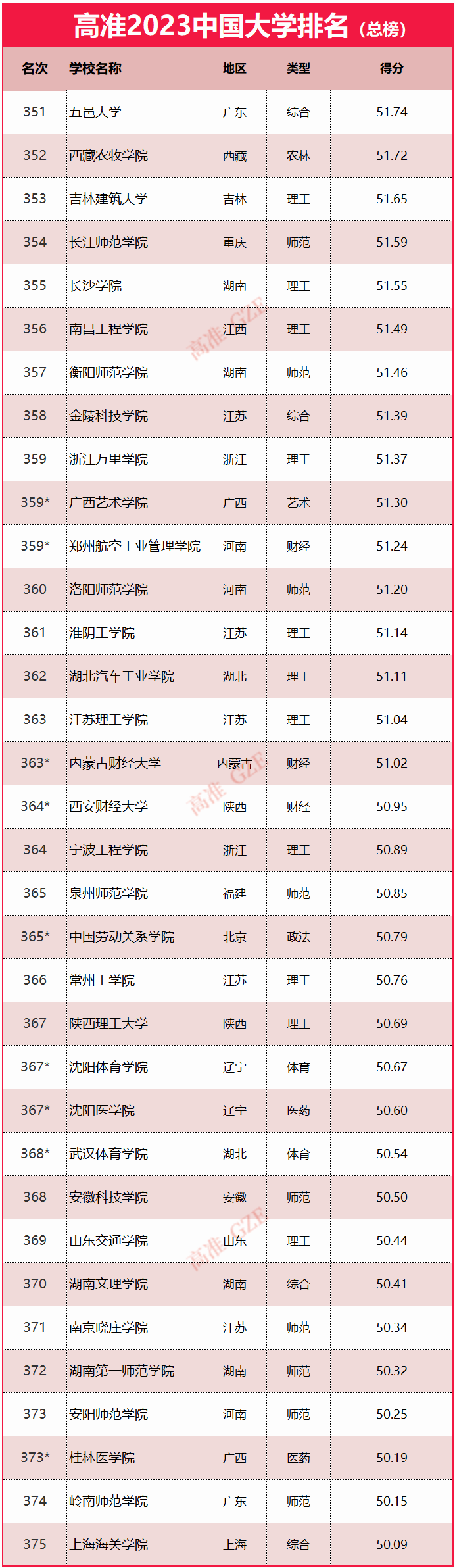 注:由于高准大学排行榜对医药类、财经类、政法类、语言类、体育类和艺术类高校进行单列排名,不占据主榜的名次,所以在总榜中对这6类学校的排名名次以*标识,带*符号为参考排名。中国科学院大学和中国社科院大学由于办学模式原因,也以参考位次进行排名。