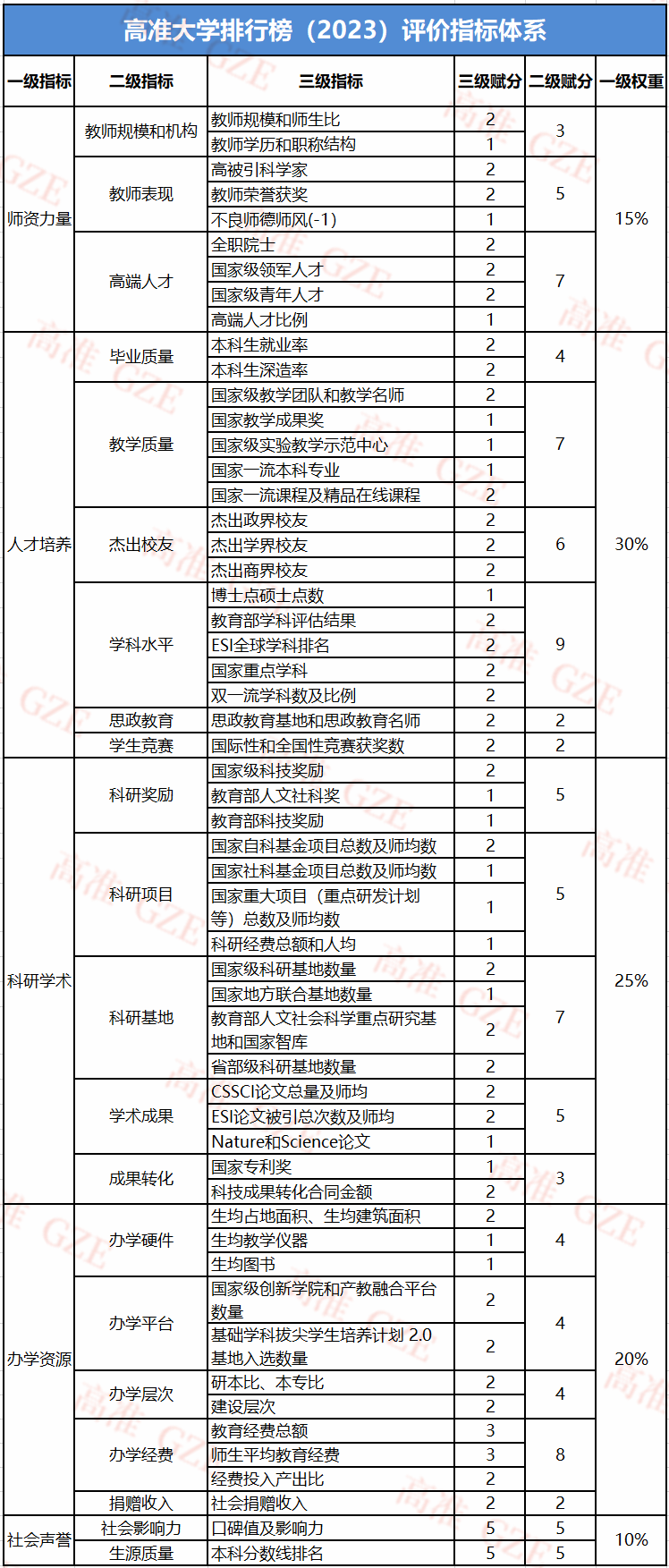 高准中国大学榜单的评价指标体系中,共设置5个一级指标,分别为师资力量、人才培养、科研学术、办学资源和社会声誉。在权重设置上,师资力量占15%,人才培养占30%,科研学术占25%,办学资源占20%,社会声誉占10%。在5个一级指标下,又遴选了21个二级指标和55个三级指标,全面客观地反映中国高校的实力状况。在指标体系中,同时兼顾理工农医和人文社科,既有总量指标也有均量指标。