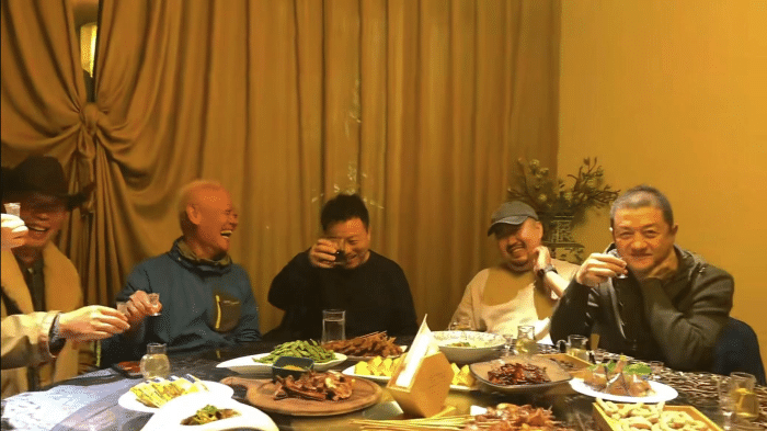 从画面来看,一行人坐在包厢内聚餐。包间内装修低调,面积也不太宽敞。大家围坐在圆桌前,桌上摆满了大鱼大肉,满是下酒菜。
