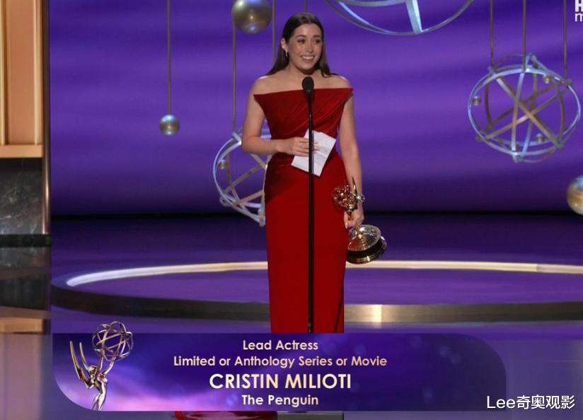 克里斯汀·米利欧缇则凭借在DC剧集《企鹅人》(The Penguin)中饰演“索菲亚·吉甘特”一角荣获本届艾美奖“限定剧/选集剧最佳女主角”。克里斯汀·米利欧缇领奖时哽咽着说,“我超爱表演!我把领奖词写在我之前做治疗的那张纸的另一面了。我热爱拍这部剧,我十分热爱饰演索菲亚,在如今,很难理解自己是如何存活于这个世界,所以我很感激这一点光亮!”