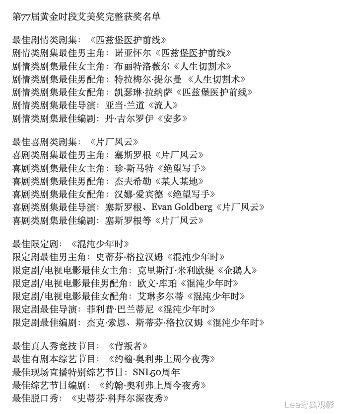 第77届黄金时段艾美奖完整获奖名单(如下图)