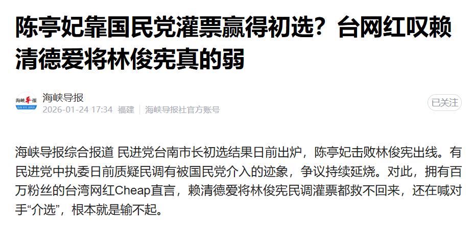 这个投票结果一出炉,立刻在岛内引起了巨大的反响。尤其是绿营内部,直接就急了,毕竟台南和高雄不容有失,一旦竞选出了问题,不仅赖清德要面临巨大危机,整个绿营恐怕都要下野,这是一个绿营无法接受的结果。