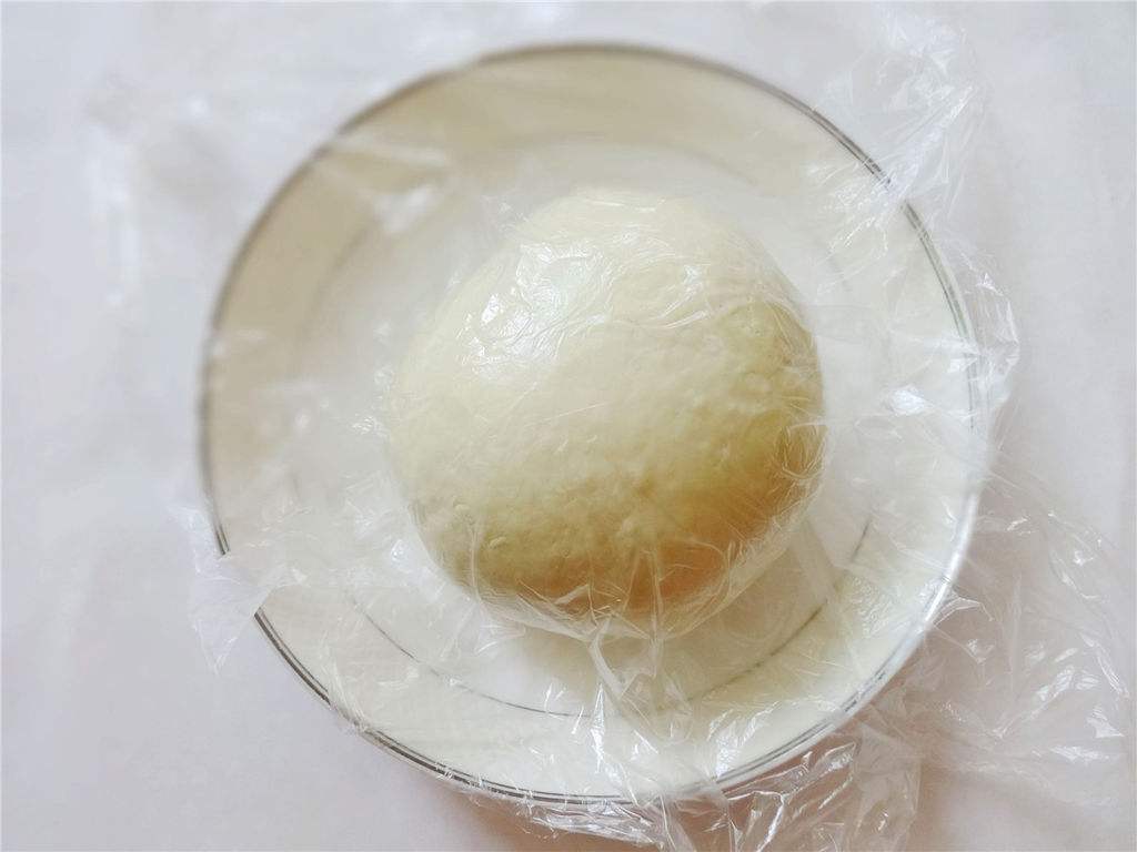 ③、盖上保鲜膜将面团发酵,大约发酵至两倍大。