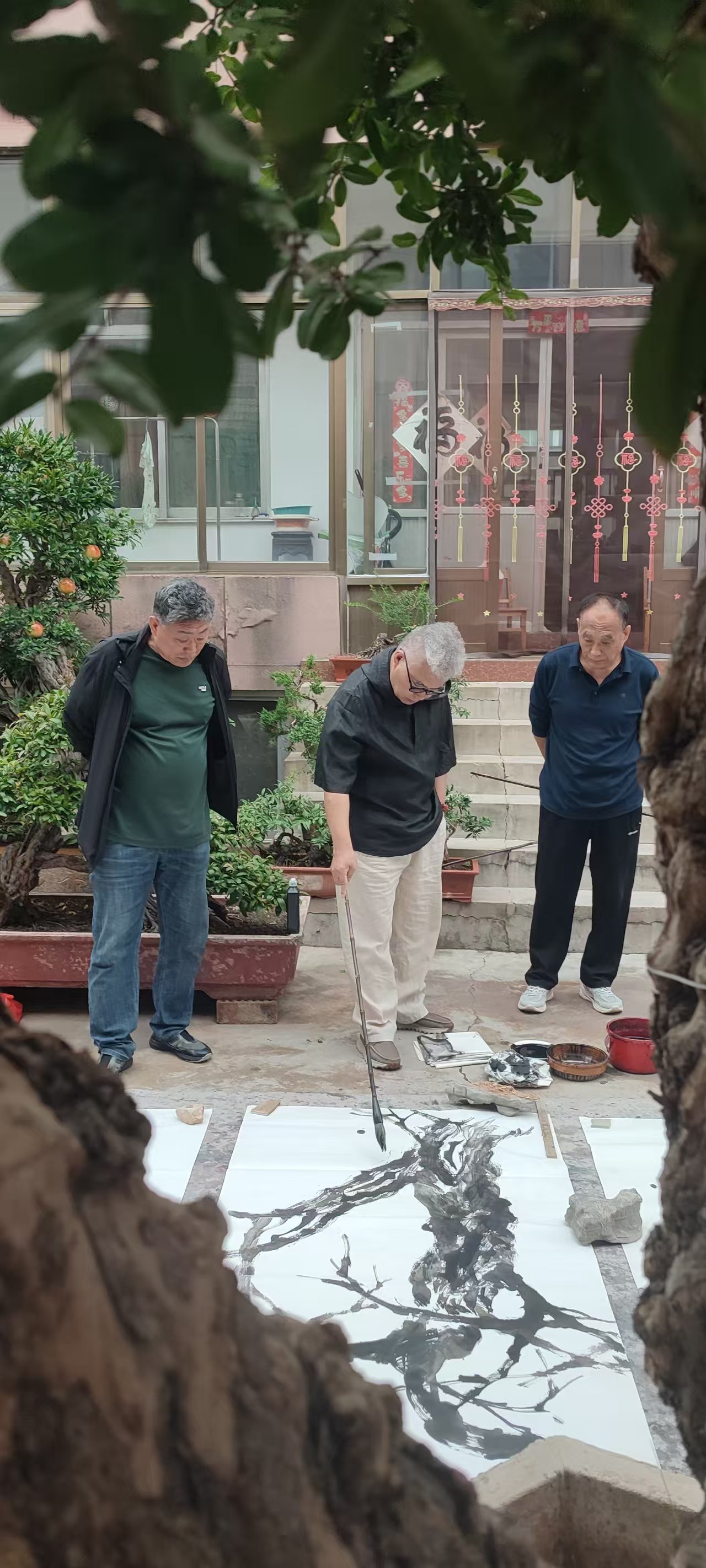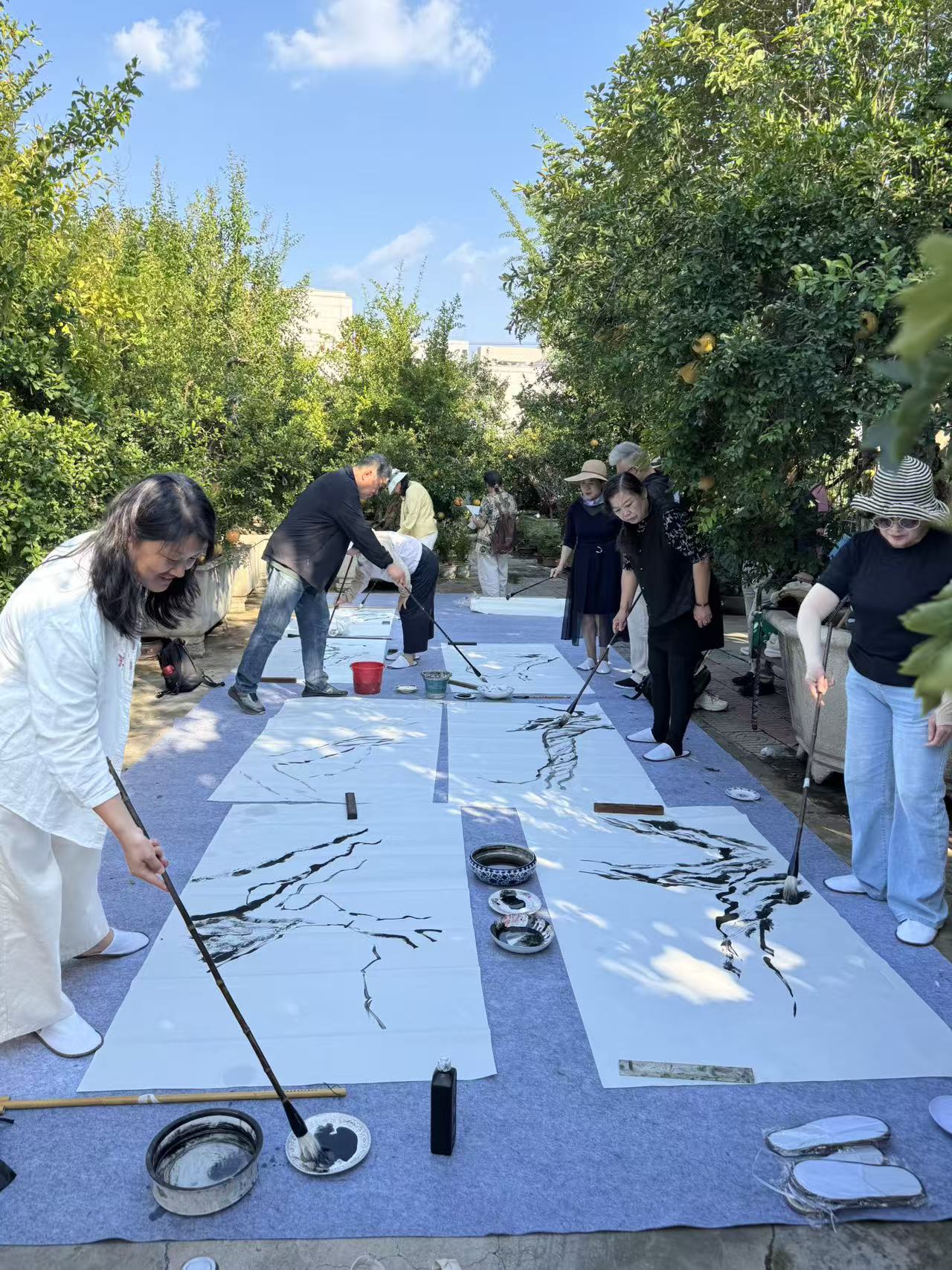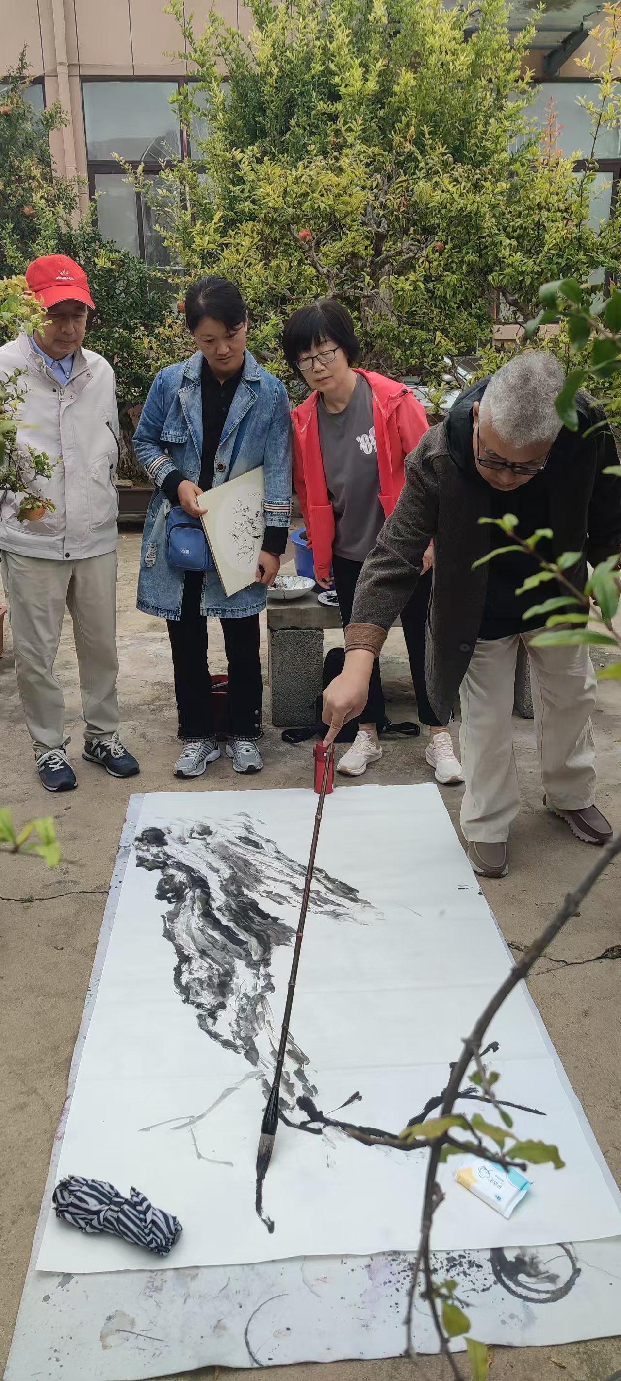 冠世榴园的古石榴林里,六尺宣纸在毛毡上铺展如毯。三十余位学员中,既有追随孙辉从8月研修班而来的“老面孔”,也有慕名加入的艺术新人;有美术教师、文化学者,也有退休后重拾画笔的长者。孙辉深谙“千人千面”的艺术规律,为每位学员定制了“7天进阶方案”。
