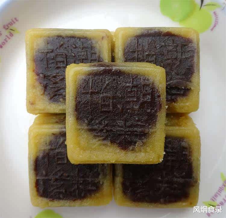 看那方正糕体,紫红洗沙配莹绿豆粉,像幅小画;