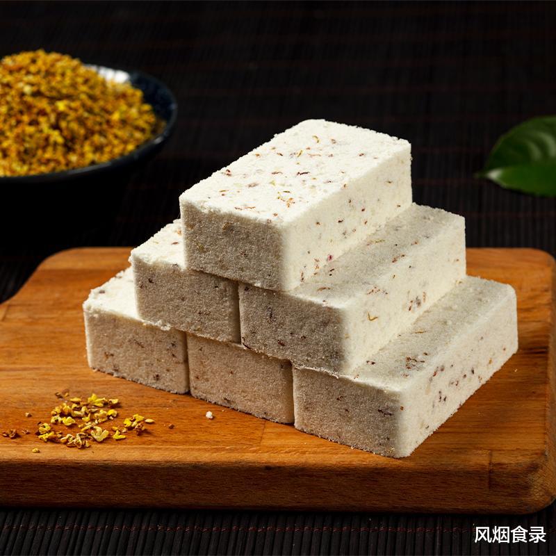 糯米泡涨后炒熟磨粉,混着熬好的糖浆和山药粉,过筛后倒入模具定型,切块后“白得像雪,甜得清透”。