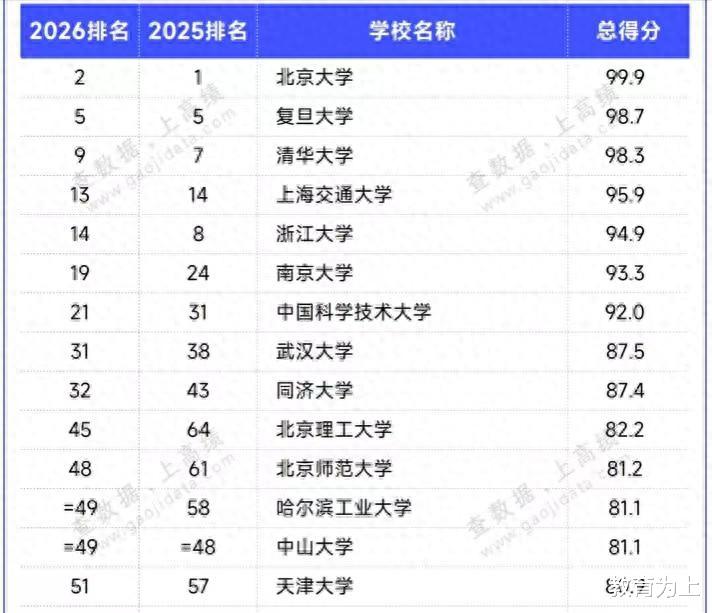 复旦大学令人意外。复旦大学与上海交通大学一起并称为上海市的“双子星”高校,其前身为创办于1905年的复旦公学,后历经国立第四中山大学医学院、上海医科大学等办学阶段,2000年原复旦大学与上海医科大学合并组建为新的复旦大学。