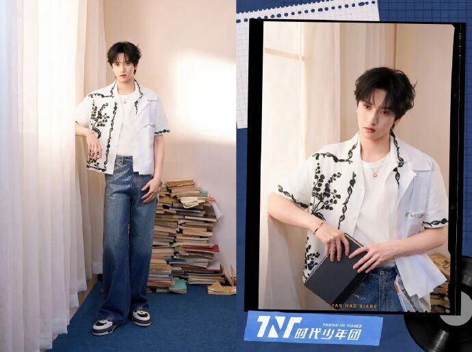 团装的 “分层逻辑”:全员走俊朗清新蓝系,但从不是 “统一穿同款”:有人是浅蓝印花衬衫搭白 T,有人是牛仔蓝长裤配淡蓝外套,还有人是淡蓝马甲叠浅蓝内搭 —— 不同深浅、不同款式的蓝调,既凑出了 “冬日清新” 的统一氛围,又给每个人留足了少年感的个人空间。金句:团装的高级从不是 “复制粘贴”,是 “同色系分层” 的青春共鸣 —— 不同蓝调搭出统一感,每个人的少年气都没被团装吃掉。