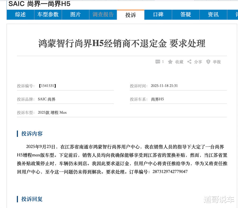 《财圈社&道哥说车》编辑注意到,第三方汽车投诉平台车质网中有这样一个投诉案例:车主购车前确认能够享受置换补贴,但补贴政策结束后,车辆仍未交付。车主因此要求退定金,但用户中心将责任推给华为,华为又将责任推回用户中心。
