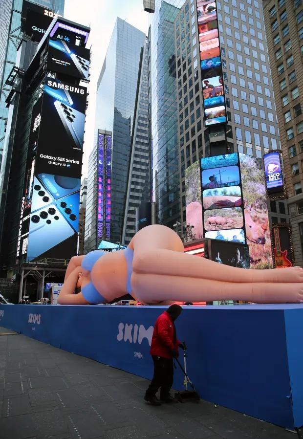 这个庞然大物正是真人秀女星金·卡戴珊的“化身”,一个18米高的充气人偶,身着卡戴珊自创品牌SKIMS的比基尼泳衣,静静地“躺”在蓝色的平台上。