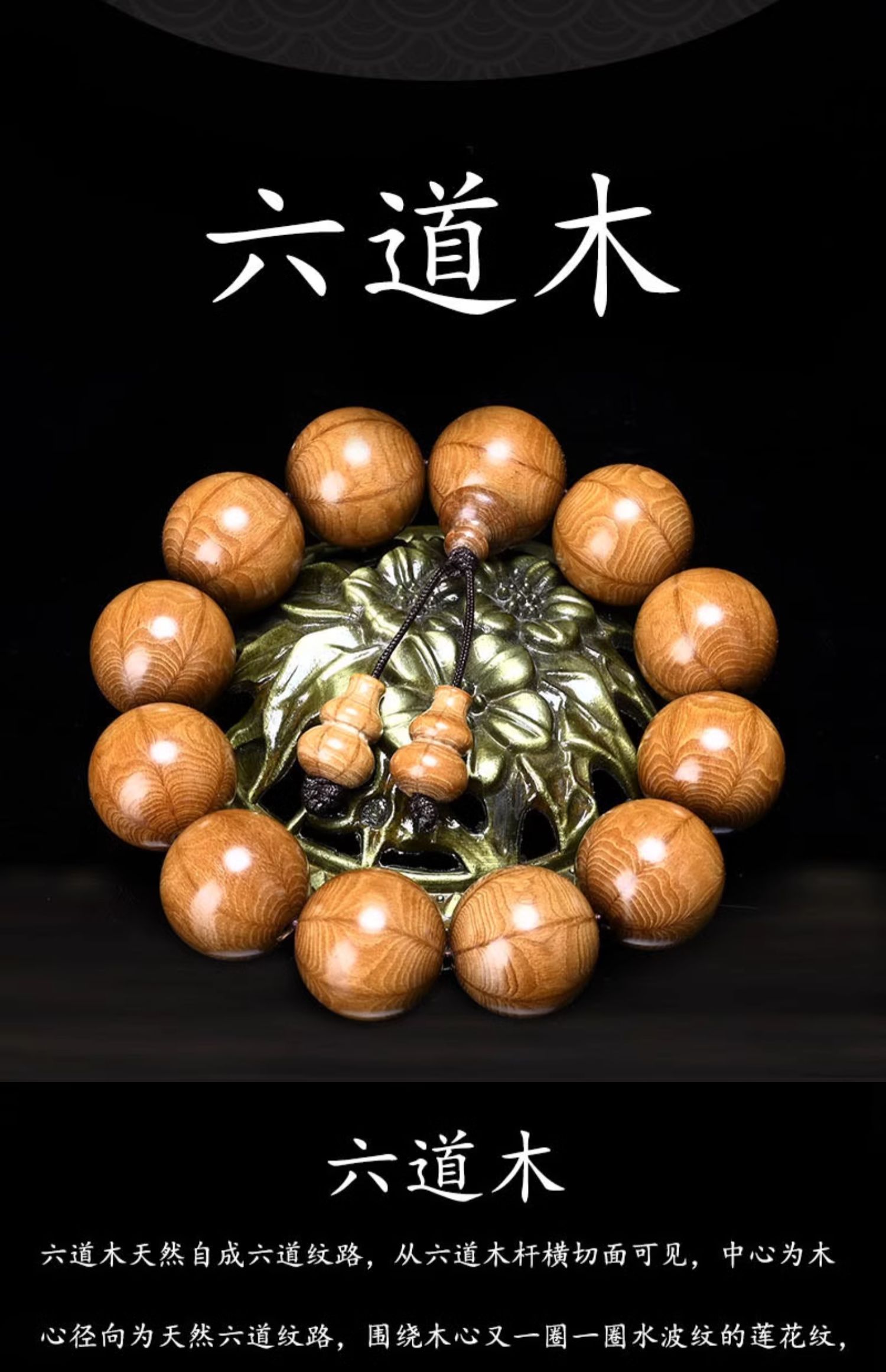店内货架上,各色串珠排列得整整齐齐。檀木的沉静、蜜蜡的温润、玛瑙的艳丽,在晨光中泛着柔和的光泽。而柜台最内侧的玻璃展柜里,一串通体泛着淡褐光泽的串珠格外醒目——那是“串珠斋”的镇斋之宝,由五台山特有的六道木制成的菩提灵珠。每颗珠子上都天然形成六道纹路,表文殊菩萨的“嗡 阿喇巴 札 那谛(ōng ā rā bā zhā nà dì)‌”六字心咒,相传戴在身上至诚祈福,便能得菩萨加持,自古以来盘念六道木咒珠十分灵验。