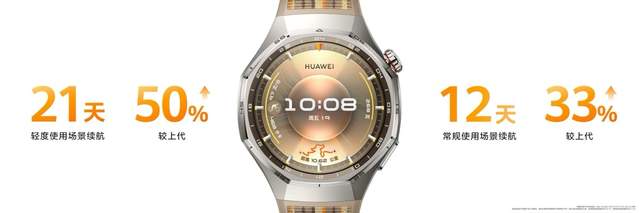 接着就是续航方面,华为WATCH GT 6系列此次主打就是超长续航。众所周知,续航是智能手表技术底座之一,续航不好的话会严重影响用户体验,因此在选购智能手表时,产品续航实力的强弱是用户购买时重要考量因素。为解决用户的续航焦虑问题,此次华为WATCH GT 6系列采用了华为首创的高硅叠片异形电池,电池密度提升37%,空间利用率提升28%,相比上一代产品电池容量提升65%,最高搭载867mAh电池,最长续航可21天。这也就意味着,我们即便是出门长途旅行十多天,都完全不必担心手表的续航问题。日常出差,华为WATCH GT 6系列更能够解决我们在手机没电情况下,重要电话接听、消费付款、交通等问题,让我们在紧急情况下,更加从容。