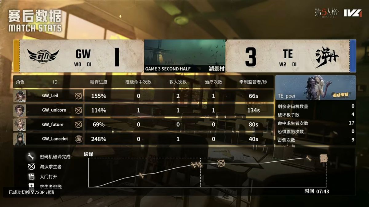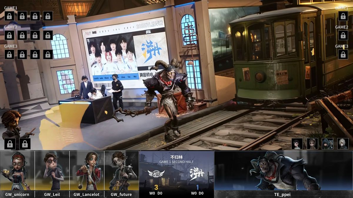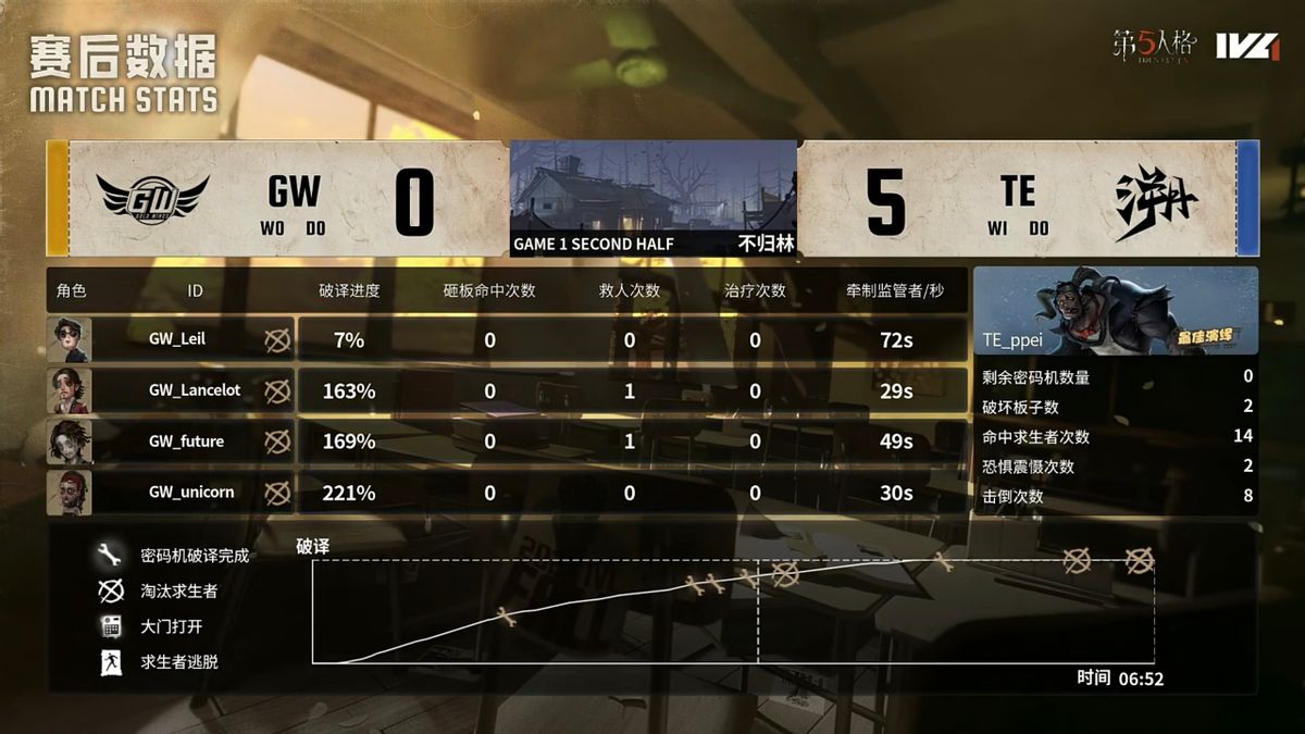 GW的求生者选择了咒术师、幸运儿、大副、木偶师;TE的监管者ppei选择了“跛脚羊”。(BAN古董商、机械师、先知、守墓人)
