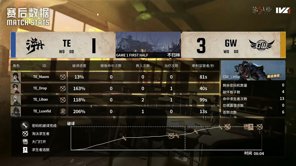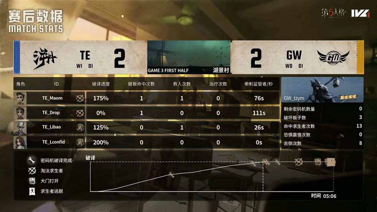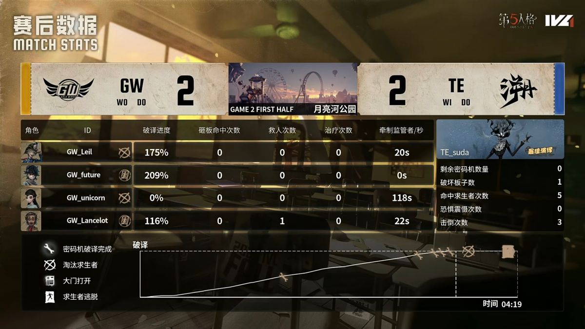 GW的求生者选择了古董商、火灾调查员、野人、病患(BAN“喧嚣”);TE的监管者suda选择了时空之影。(BAN先知、“逃脱大师”、佣兵、飞行家)