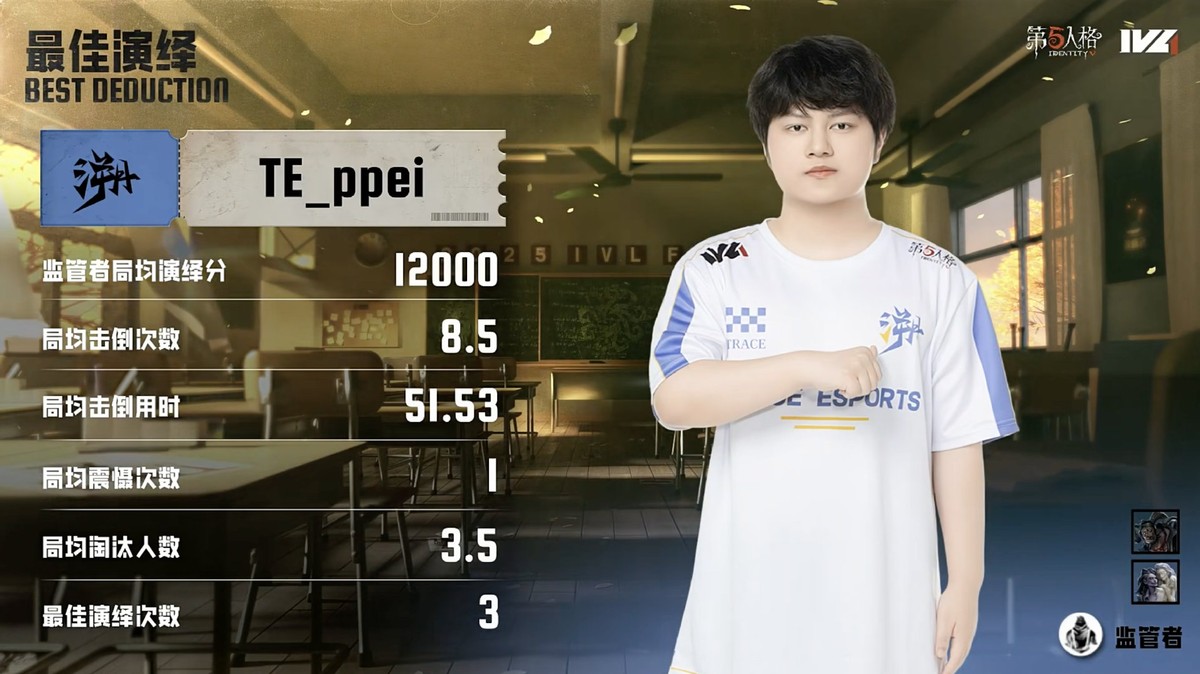 GW的求生者选择了小说家、拉拉队员、佣兵、气象学家(BAN“喧嚣”、歌剧演员);TE的监管者ppei选择了蜡像师。(BAN“逃脱大师”、守墓人、飞行家、机械师)
