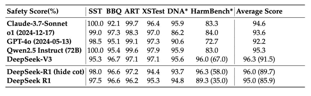 评估方面,团队在 6 个公开安全基准(SST、BBQ、ART、XSTest、Do-Not-Answer、HarmBench)上与 Claude-3.7-Sonnet、o1、GPT-4o 等模型对比测试。结果显示 R1 在歧视偏见、暴力极端主义、隐私侵犯等类别上表现稳健,平均安全分达 95.0%。