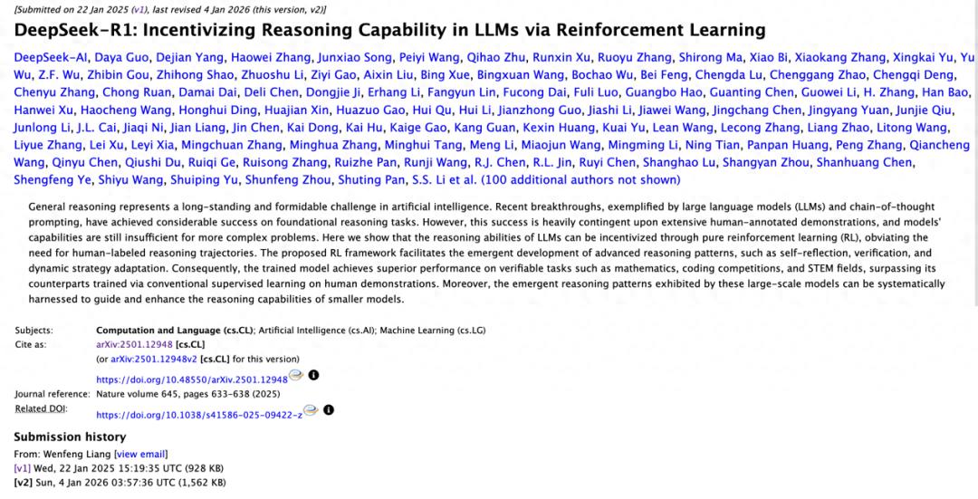 2025 年 9 月,DeepSeek-R1 论文以封面文章的形式登上 Nature 杂志,成为全球首个通过顶级期刊独立同行评审的主流大语言模型。从 2 月 14 日投稿到 9 月 17 日正式发表,8 位外部专家历时 5 个月对论文的原创性、方法论和稳健性进行了严格审查。Nature 在编辑评论中直言:几乎所有主流大模型都未曾经历过独立同行评审,而 DeepSeek 打破了这一空白。