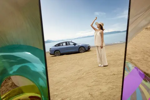 最让人惊喜的是它的溜背设计,17.2°的黄金溜背角度,既保留了运动感,又通过车身结构优化避免了后排头部空间压抑的问题。身高175cm的邻居坐进后排,头部仍有一拳余量,彻底打破了"溜背车=空间牺牲"的魔咒。车身侧面的双腰线设计增加了层次感,配合18英寸轮毂,整体姿态沉稳又不失灵动,不管是日常通勤还是家庭出游,都能hold住各种场景。车漆质感也是需要点赞,星夜蓝与摩根粉等配色在不同光线下呈现细腻变化。尾部断点贯穿式尾灯亮度柔和,夜间辨识度佳。整体设计在保留电动车科技感的同时,注重实用性与耐看度。