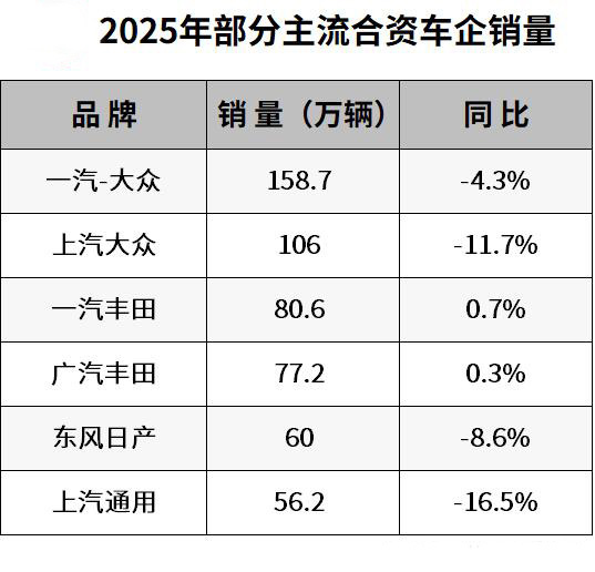 🌐 合资品牌加速电动化转型• 一汽-大众销售158.7万辆,蝉联合资品牌销量第一• 上汽大众销售106万辆• 丰田系表现稳定:一汽丰田80.6万辆(+0.7%)、广汽丰田77.2万辆(+0.3%)