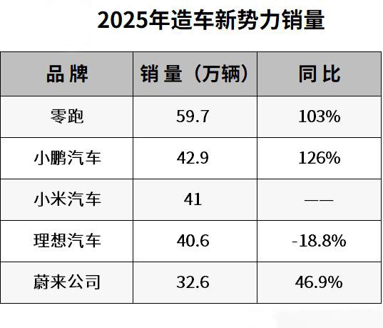 🚀 新势力销量分化明显• 零跑汽车交付59.7万辆(同比增长103%)• 小鹏汽车交付42.9万辆(同比增长126%)• 小米汽车交付超41万辆,超额完成年度目标• 理想汽车交付40.6万辆(同比下降18.8%)• 蔚来汽车交付32.6万辆,创年度新高