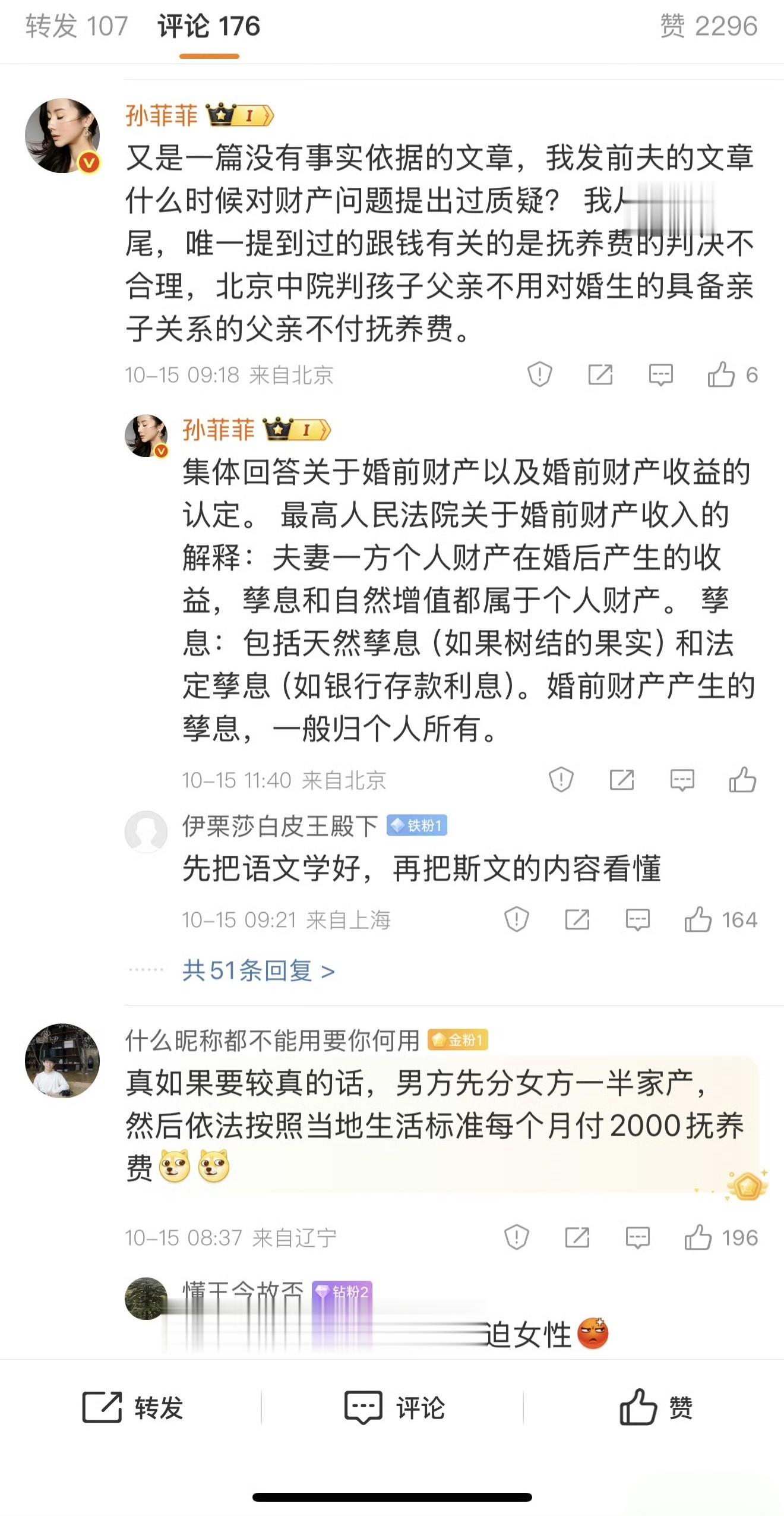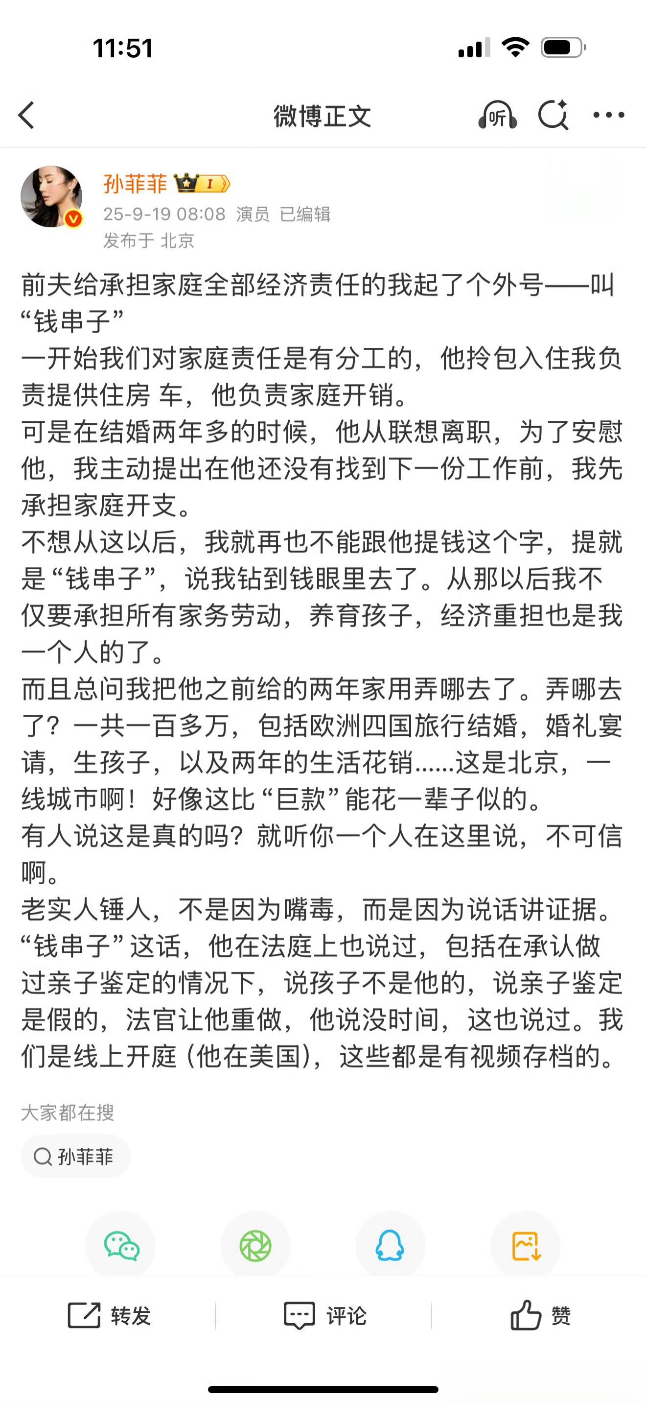 婚内所有开销(房产、车辆、子女教育、生活费)均由孙菲菲承担。前夫史宏(美籍华人,联想前总监)婚后第二年便不再负担家用,甚至因孙菲菲拒绝代付700元电动牙刷费用爆发冲突。
