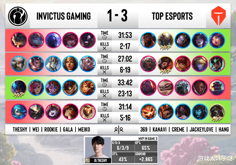 可现实却狠狠泼了大家一盆冷水——TES几乎是碾压式地以3比1轻松取胜,让观众们大跌眼镜,纵观整场比赛,IG的表现令人失望,无论是BP环节的思路,还是场上的执行力,甚至包括队员之间的配合,都显得极为混乱。