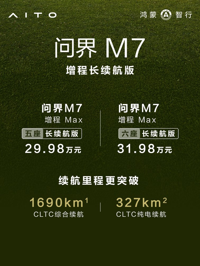同日,全新问界M7增程长续航版正式上市,其中增程Max五座长续航版售价29.98万元,增程Max六座长续航版售价31.98万元,即刻下定,可享受至高60000元购车权益。