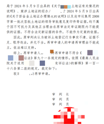 2024年3月,沧州市中级法院作出二审行政判决,维持“撤销变更登记”的判项,但因房屋已拆迁、王某霞去世,撤销了“恢复原登记状态”的判项。彭某金随后向河北省高级法院申请再审,2025年2月,河北高院裁定驳回其再审申请。