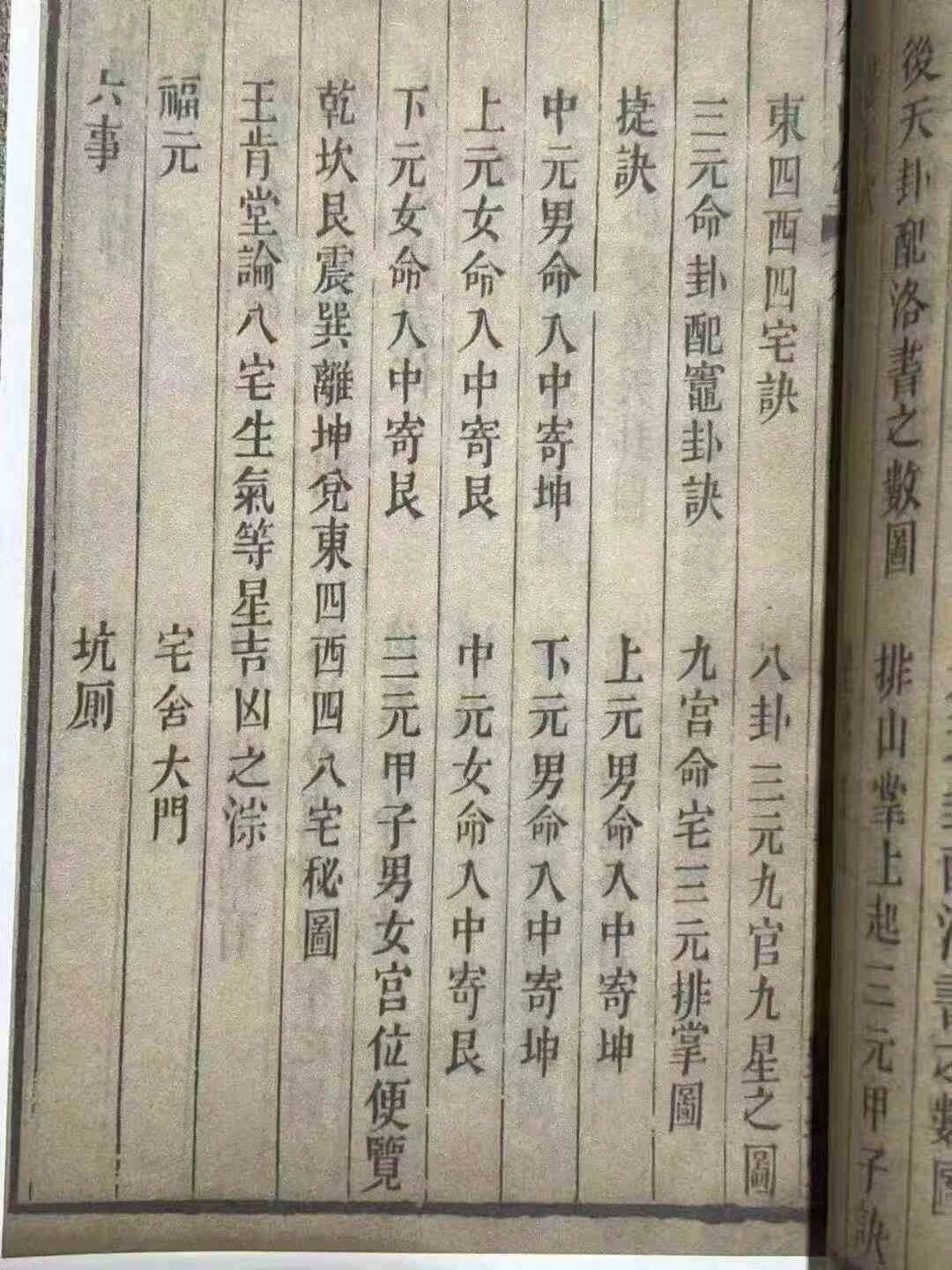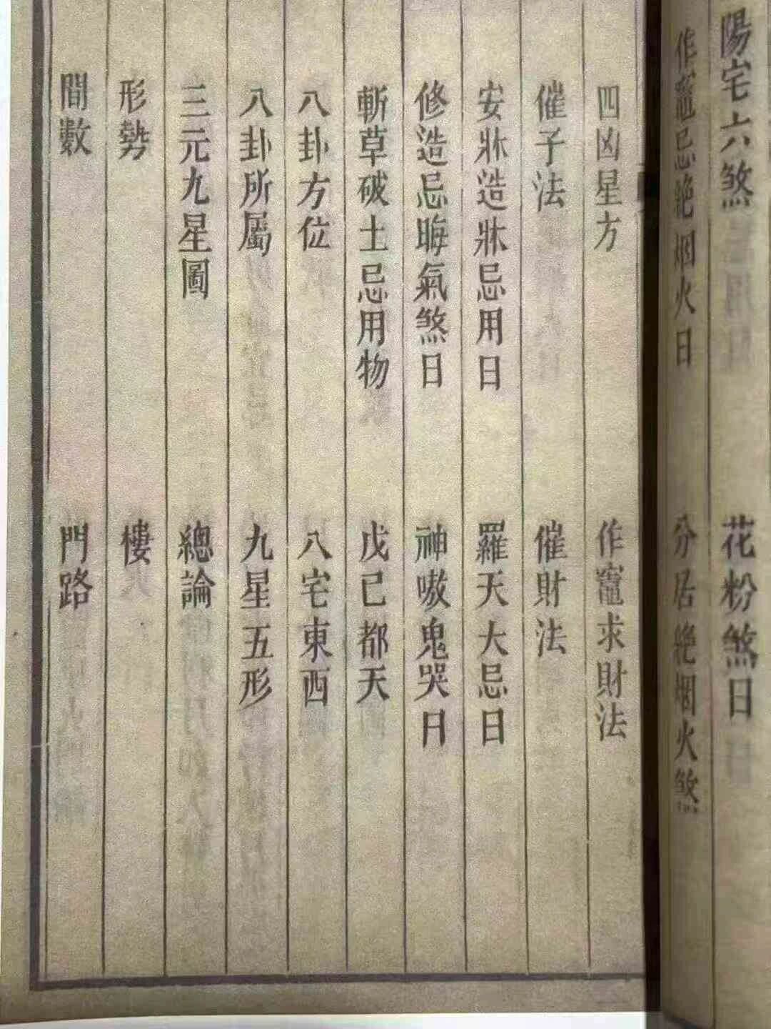 全书上下两卷逻辑超清晰,完全为实用而生:六十花甲纳音精准匹配个人命局,三元九星图直观标注吉凶方位;怕家宅犯煞?阳宅六煞、四凶星方的规避技巧直接划重点;想纳福添喜?四星吉方布局、催财妙招手把手教。备婚新人查嫁娶周堂图避忌讳,求子家庭背子嗣口诀沾喜气,甚至修造破土、斩草动工的忌用物都列得明明白白,就算是风水小白,照着做也能少走弯路。