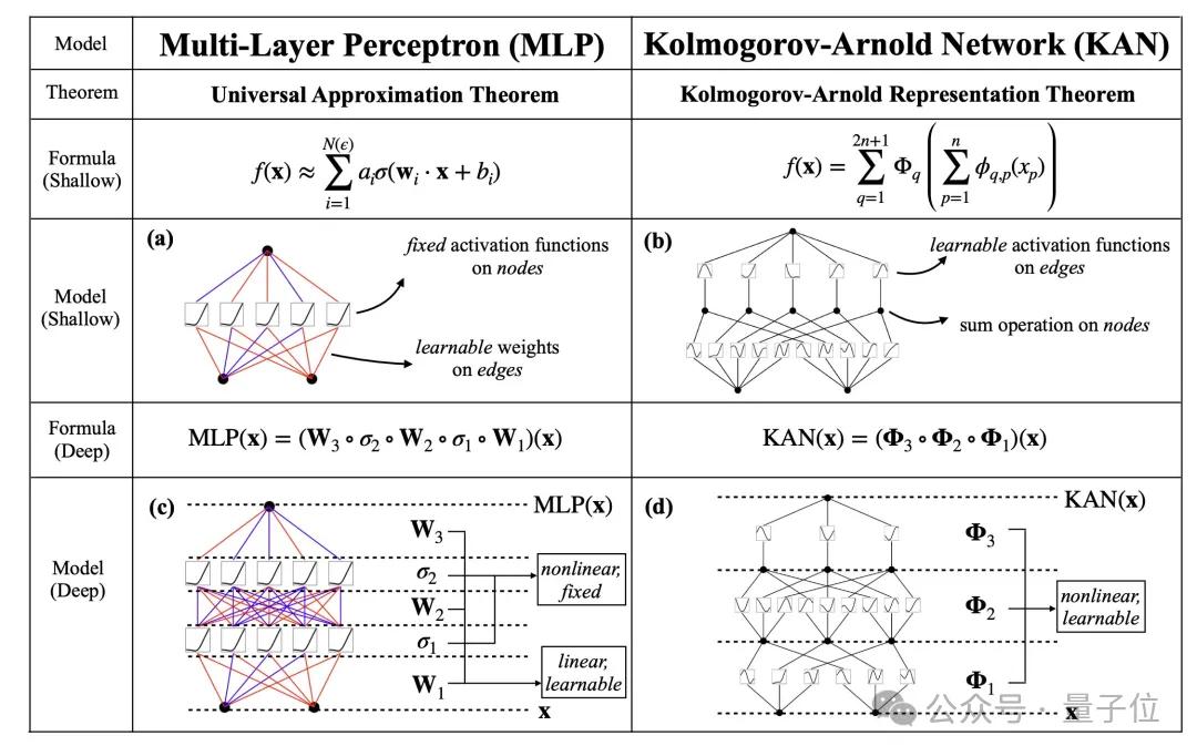 也就是说,KAN完全无需线性权重:MLP在节点上使用固定激活函数,而KAN则可将学习的激活函数置于边(权重)上,每条边的线性权重被单变量函数替代。