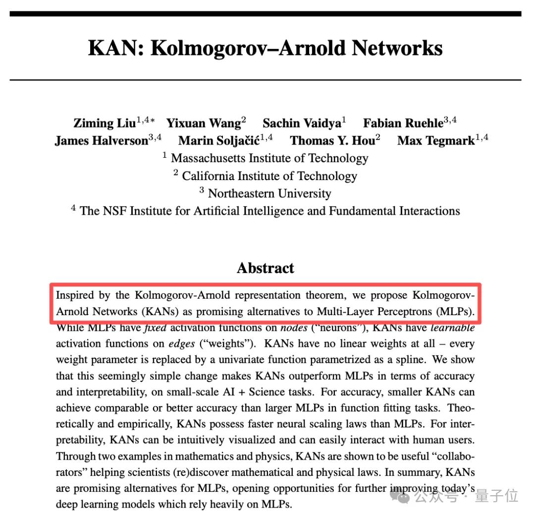 KAN正是刘子鸣和Max Tegmark合作的成果。刘子鸣在Max Tegmark指导下,致力于提升神经网络的可解释性,KAN(Kolmogorov-Arnold Networks)的初始灵感,就是想从Kolmogorov-Arnold这个数学定理出发,打开神经网络“黑盒”。